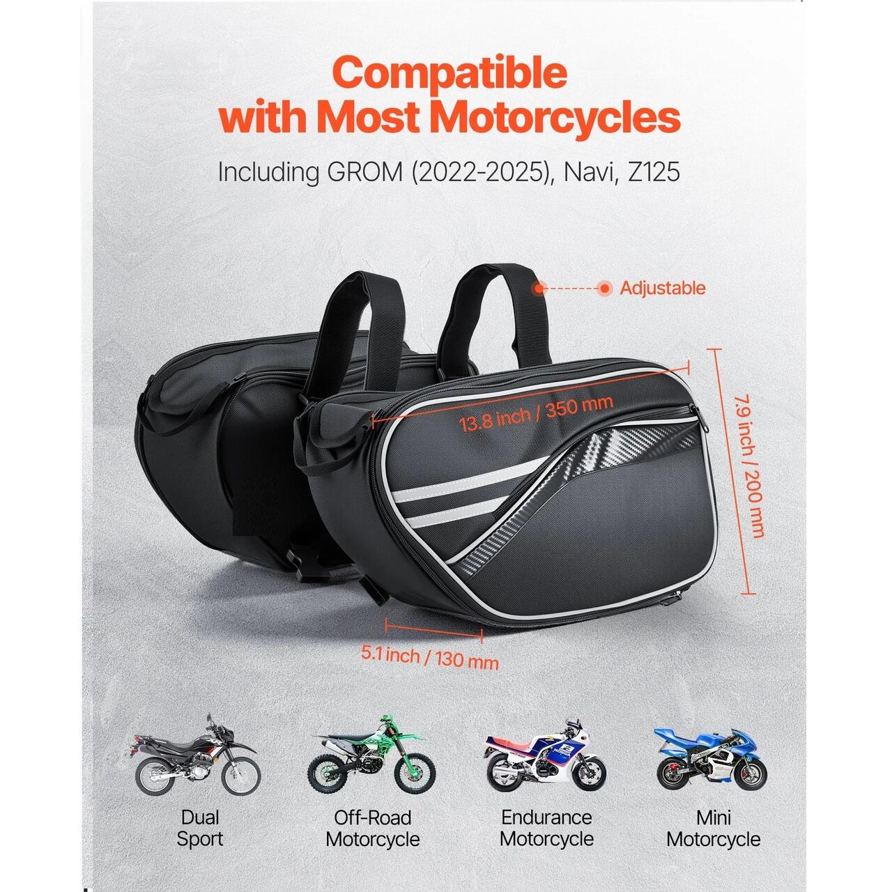 Compatibila cu majoritatea motocicletelor: Aceasta geanta de sa pentru motocicleta se potriveste majoritatii motocicletelor, inclusiv motociclete dual sport, off-road, endurance etc. Compatibila cu GROM (2022-2025), Navi, Z125 si majoritatea mini motocicletelor. Cureaua reglabila cu sistem de arici conecteaza in siguranta cele doua genti.