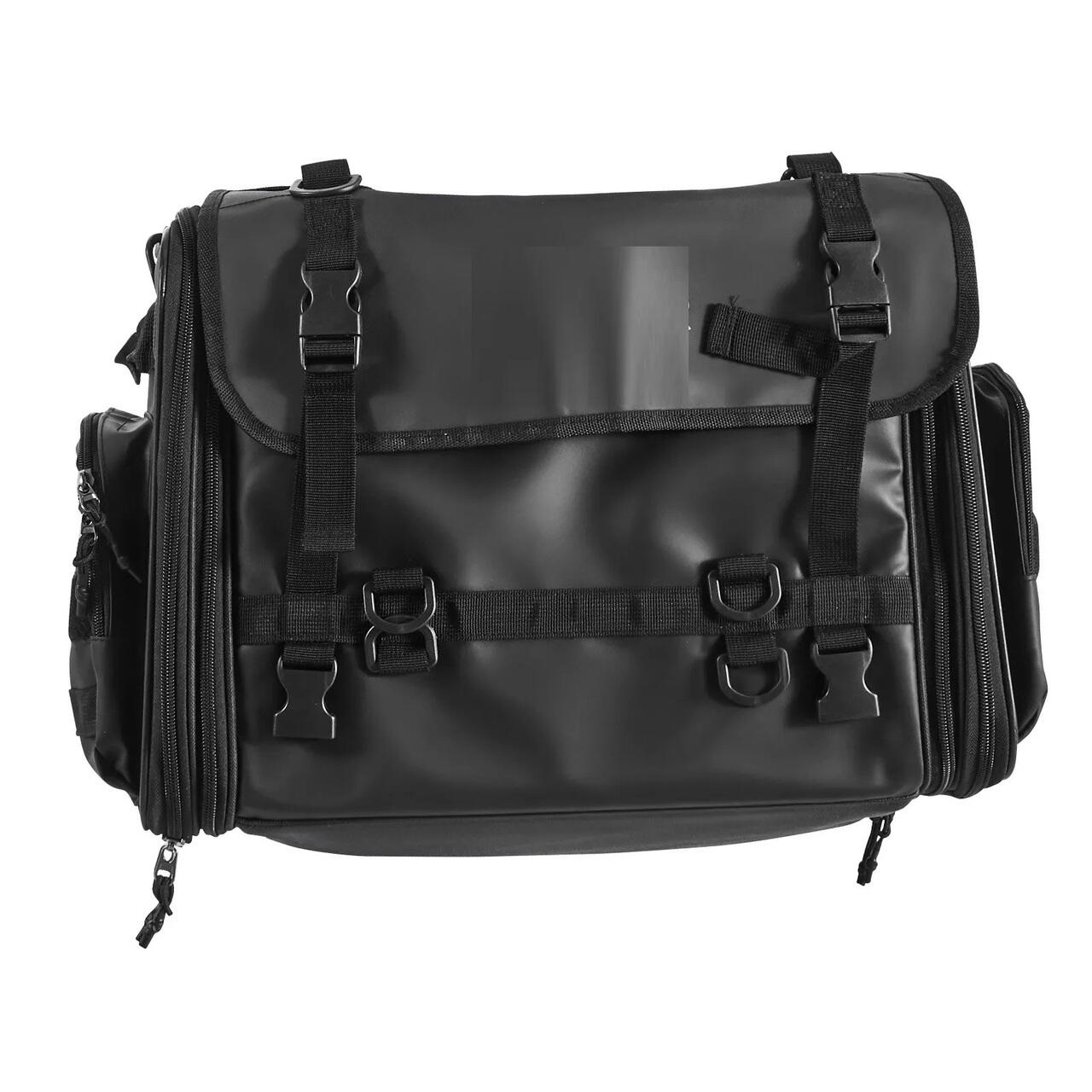 Design practic si versatil: Geanta de spate pentru motocicleta are deschideri mari in partea superioara si laterala pentru acces facil. De asemenea, are curele elastice pentru atasarea manusilor sau a unui scaun pliabil si benzi laterale cu arici pentru fixarea curelelor exterioare.