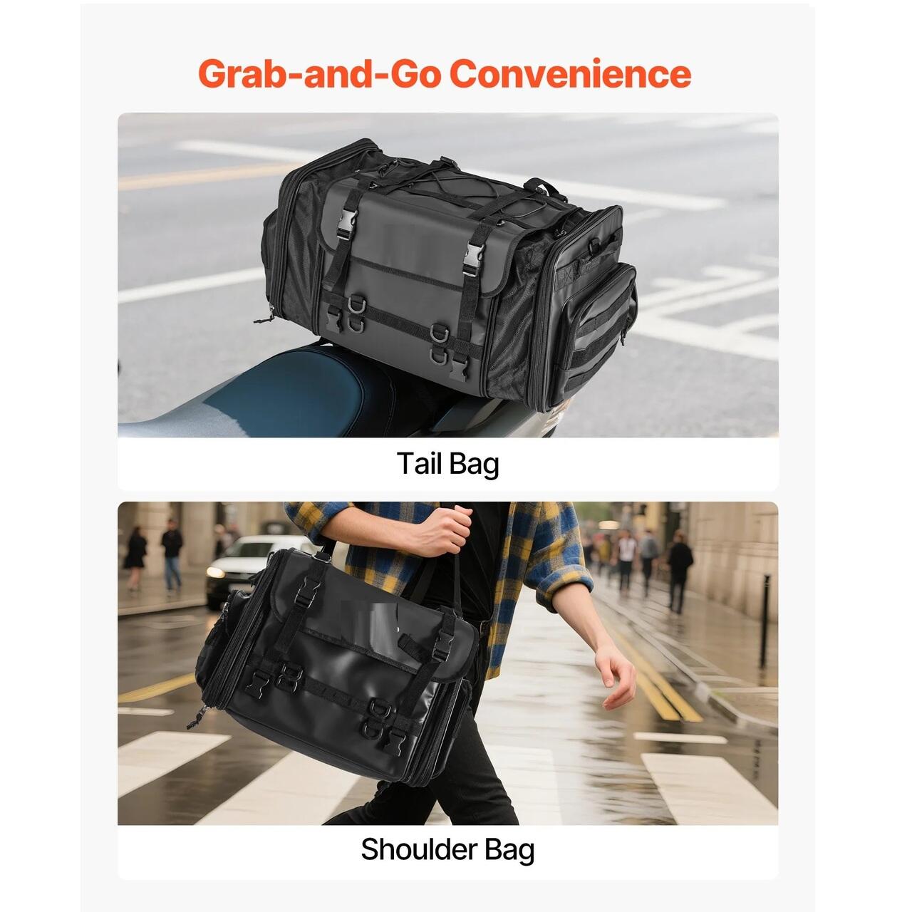 Geanta multifunctionala: Cu curelele incluse, geanta pentru saua motocicletei se transforma intr-o geanta de mana sau o geanta crossbody pentru transport usor in afara motocicletei. Se pliaza compact pentru un spatiu minim de depozitare in dulap atunci cand nu este utilizata.