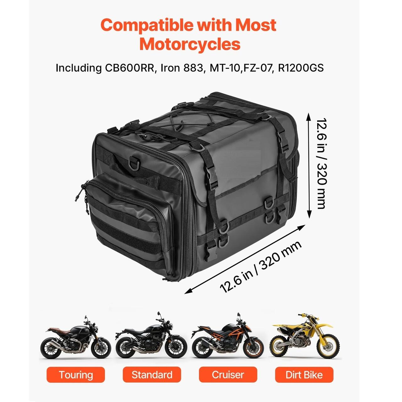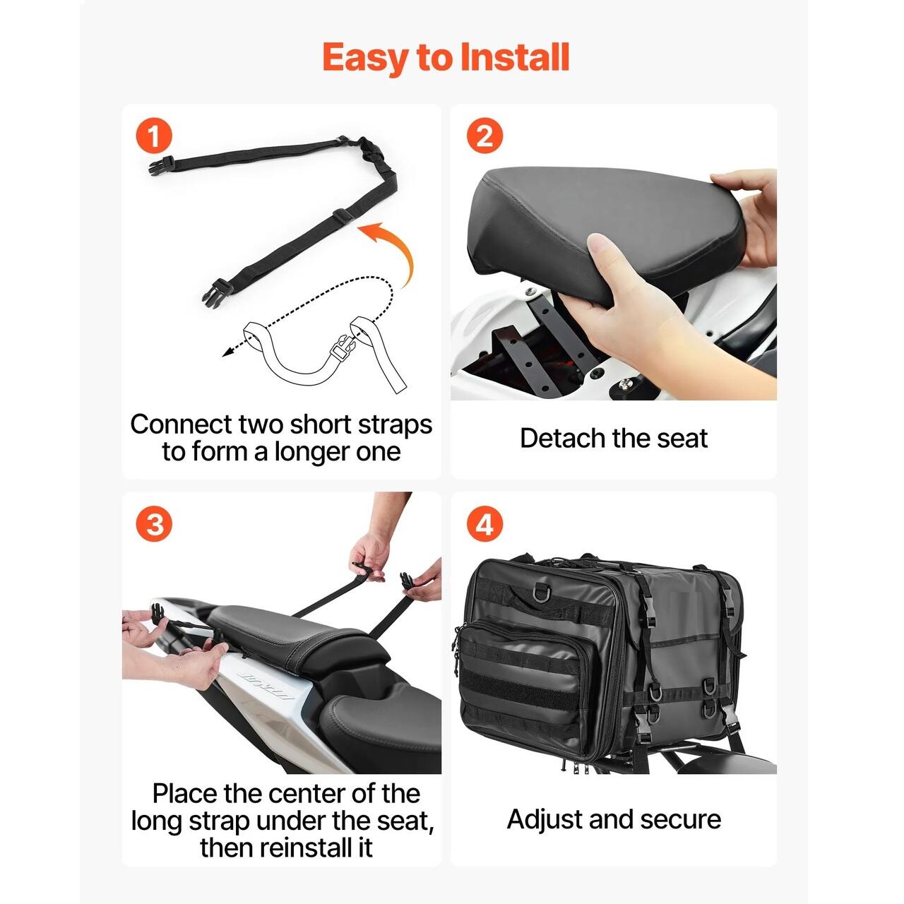 Compatibil cu majoritatea motocicletelor: Aceasta geanta de spate pentru motocicleta este conceputa pentru a se potrivi majoritatii motocicletelor, inclusiv touring, standard, cruiser si motociclete de teren. Se instaleaza rapid folosind patru curele fixate sub bancheta din spate, oferind o fixare stabila si antiderapanta.