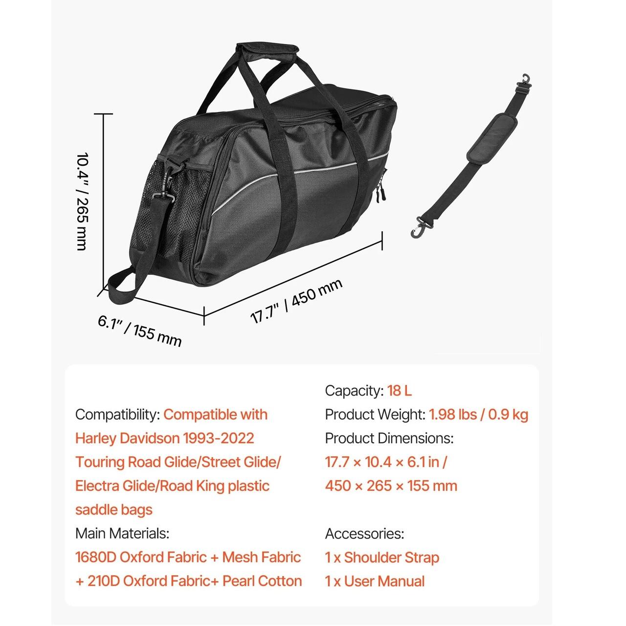 Material Durabil: Fabricata din nailon de inalta densitate, aceasta captuseala pentru geanta de sa pentru motocicleta este rezistenta la stropire, la zgarieturi si blocheaza eficient praful. Usor de curatat, este excelenta pentru utilizarea zilnica si conceputa pentru a rezista la uzura.