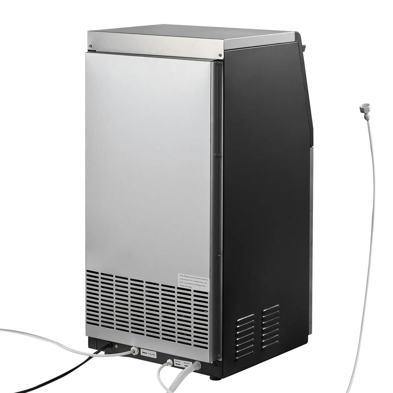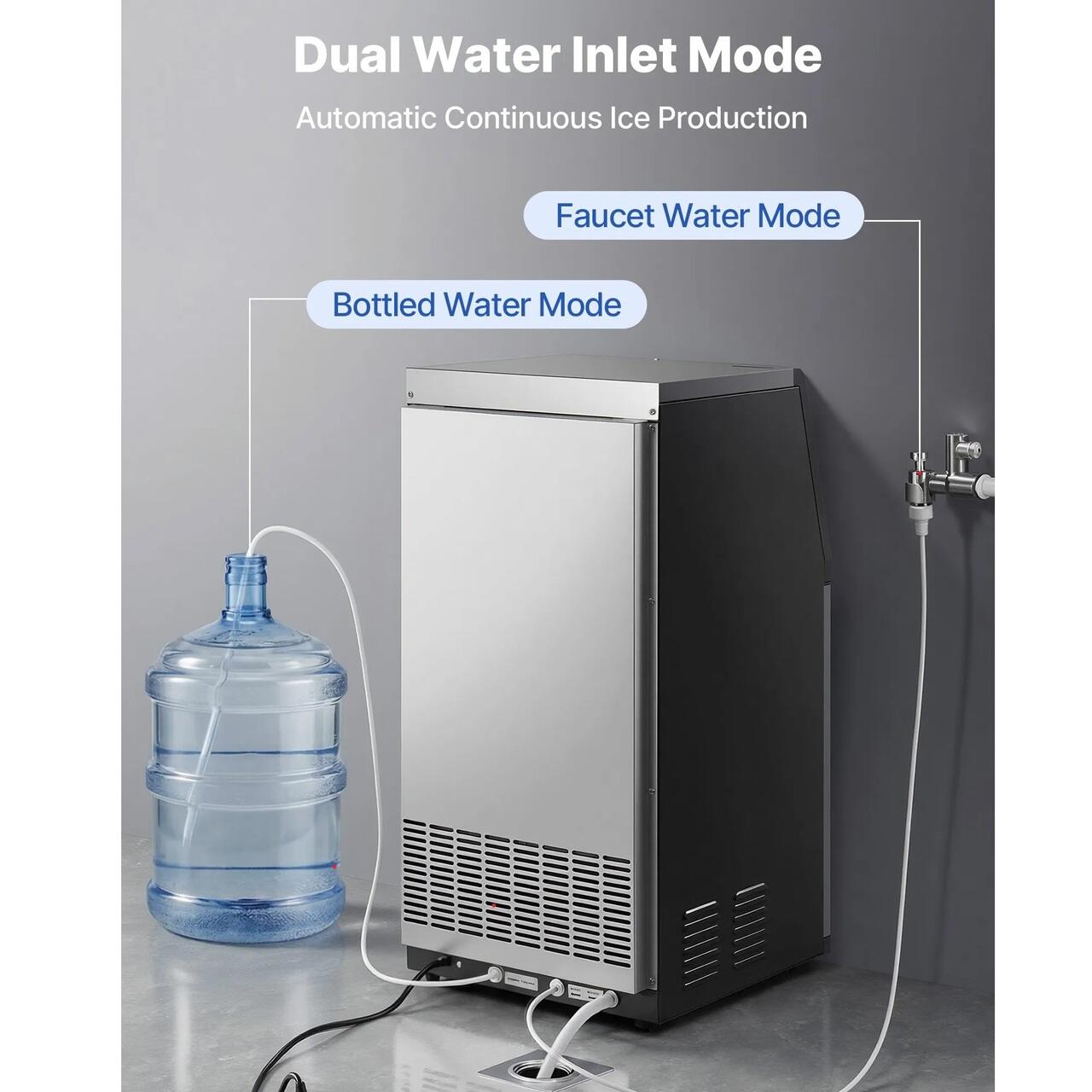 Intrare dubla a apei pentru o configurare flexibila: Doua optiuni de alimentare cu apa pentru conectarea la un robinet sau utilizarea cu apa imbuteliata, cu un set complet de accesorii inclus pentru conectarea furtunului de admisie si de scurgere pentru a sustine umplerea automata, scurgerea automata si pornirea ciclului de gheata. Mentineti aparatul de gheata in pozitie verticala timp de 24 de ore inainte de utilizare.