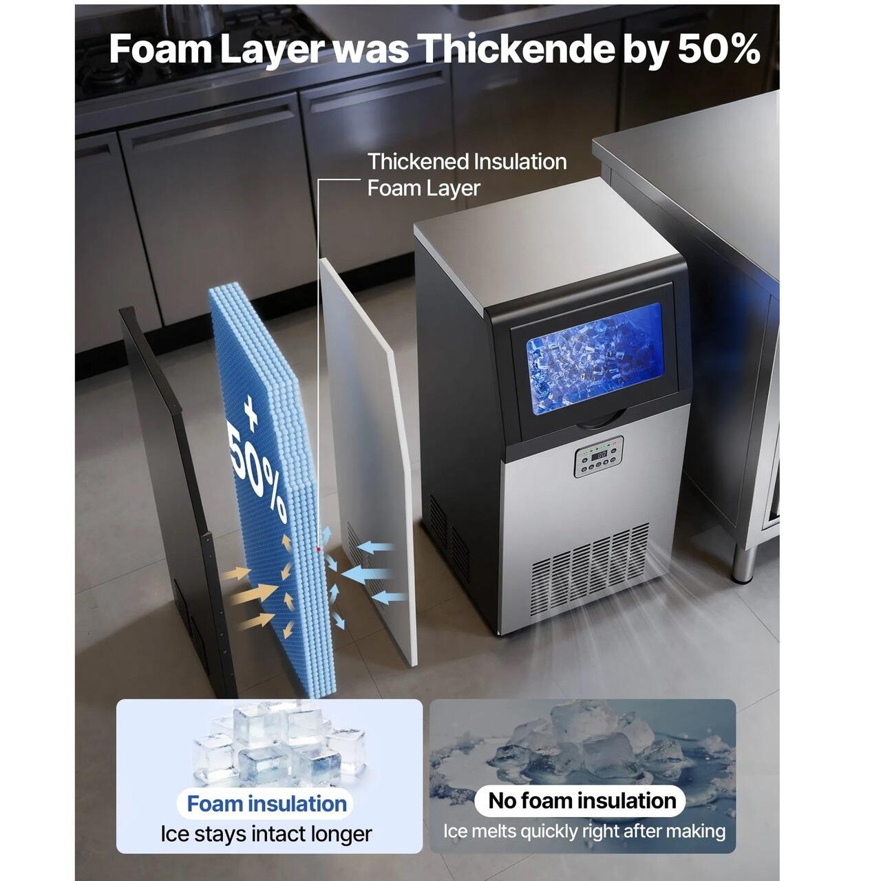 Performanta remarcabila de izolatie: Masina noastra de gheata produce cuburi de gheata patrate de 22 mm (0,87 in) cu un aspect transparent. Este certificata ETL, iar stratul de izolatie integrat din spuma ciclopentan, combinat cu un exterior din otel inoxidabil, blocheaza eficient caldura externa. Chiar si atunci cand masina este oprita, poate mentine gheata congelata timp de 6-8 ore.