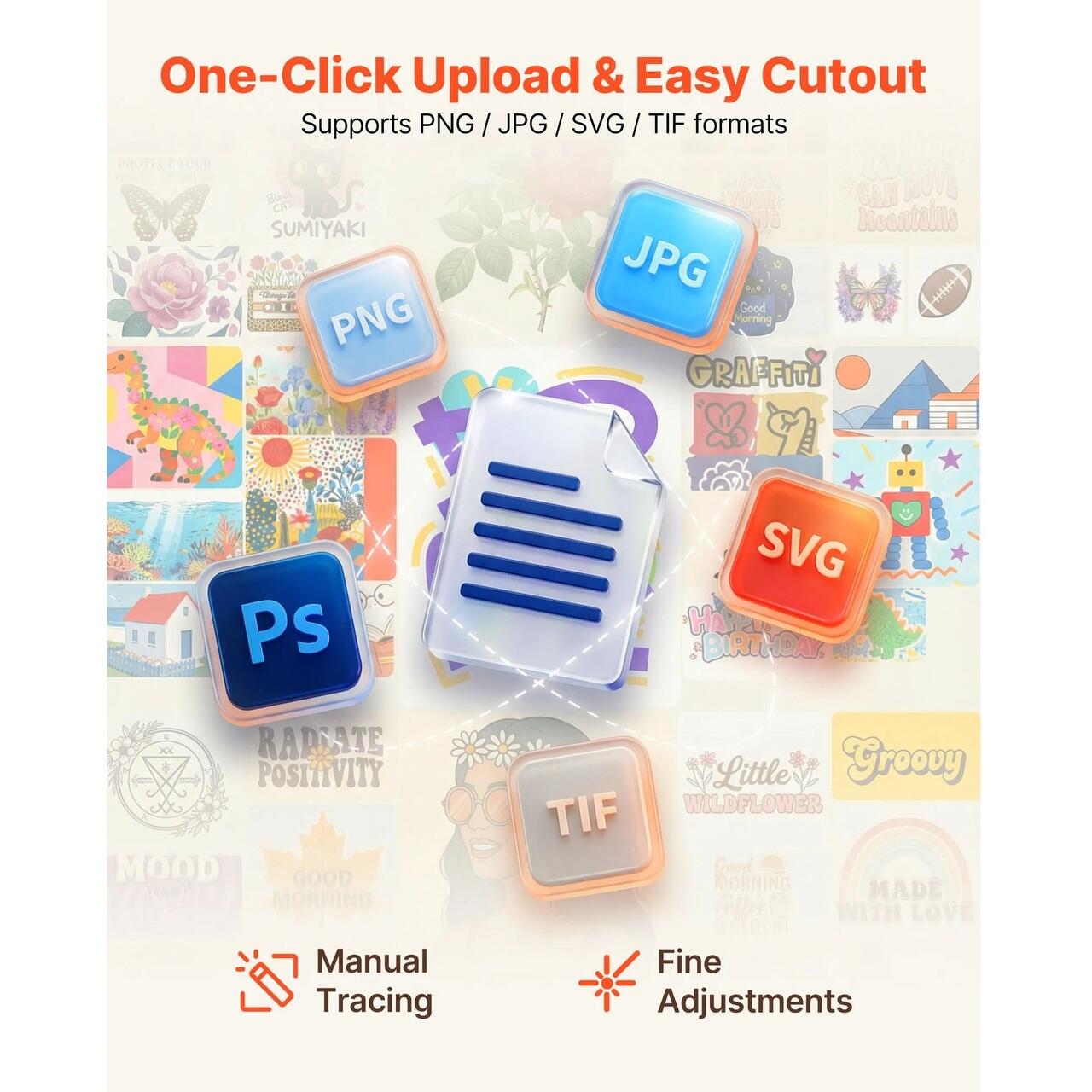 Gestionati cu usurinta designuri detaliate: Aceasta masina de taiat vinil accepta formate de fisiere PNG, JPG, SVG si TIF pentru importul si exportul usor al imaginilor. De la linii fine la modele detaliate, va ajuta sa dati viata designurilor dvs. fara a va simplifica lucrarile de arta.