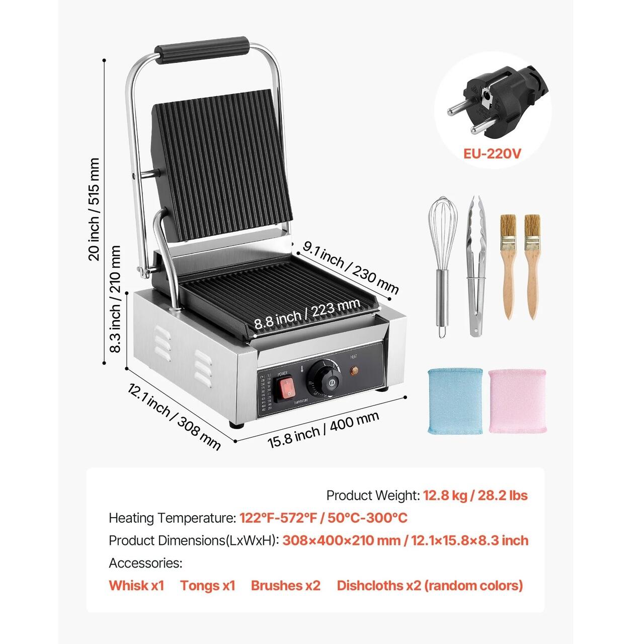 Grill Panini, Profesional, suprafata de gatit Striata/Striata 22x23 cm, controlul temperaturii 50°C la 300°C, Placi emailate din fonta, 1800 W