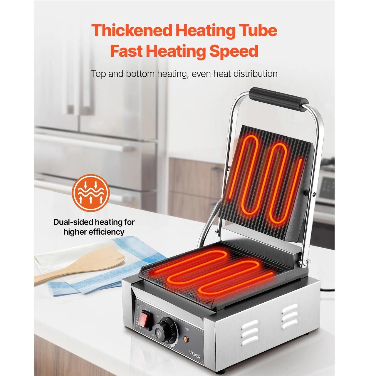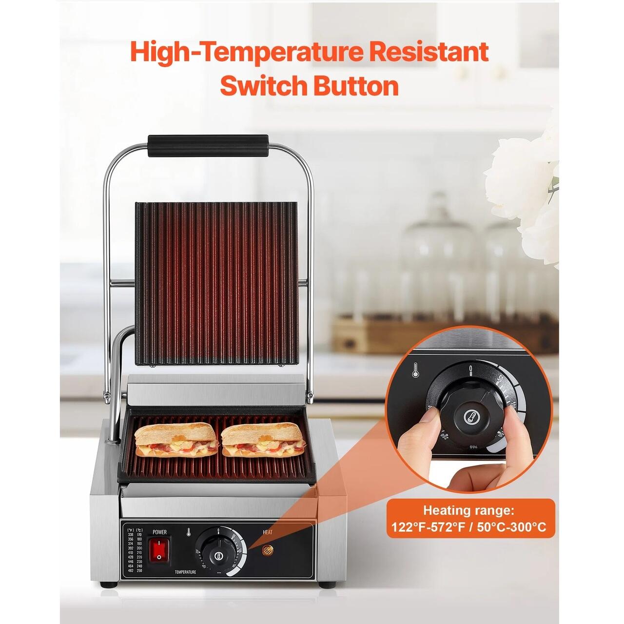 Durabil si de lunga durata: Acest gratar panini comercial are un exterior din otel inoxidabil si o placa de gratar ingrosata cu un strat de email. Manerul extins din ABS nu va provoca arsuri, iar picioarele antiderapante ofera siguranta suplimentara.