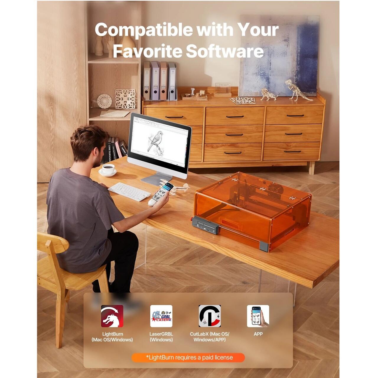 Compatibilitate software usoara: Acest gravator laser inclus este compatibil cu LaserGRBL (Windows, doar pentru dispozitive cu viteza redusa), LightBurn (Mac OS/Windows, platit) si CutLabX (Mac OS/Windows/Aplicatie). Bucurati-va de flexibilitate cu suportul Wi-Fi (doar pentru aplicatia CutLabX) si optiunile de gravare offline.