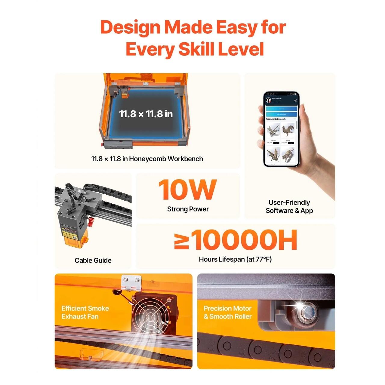 Productivitate remarcabila: Clasa laser: Clasa 1, Putere de iesire: 10000 mW. Cu viteze de pana la 7.000 mm/min si o zona de lucru de 29 x 29 cm, acest gravator laser pentru lemn taie 0,2 cm de tei intr-o singura trecere, la fel de usor ca felierea untului.