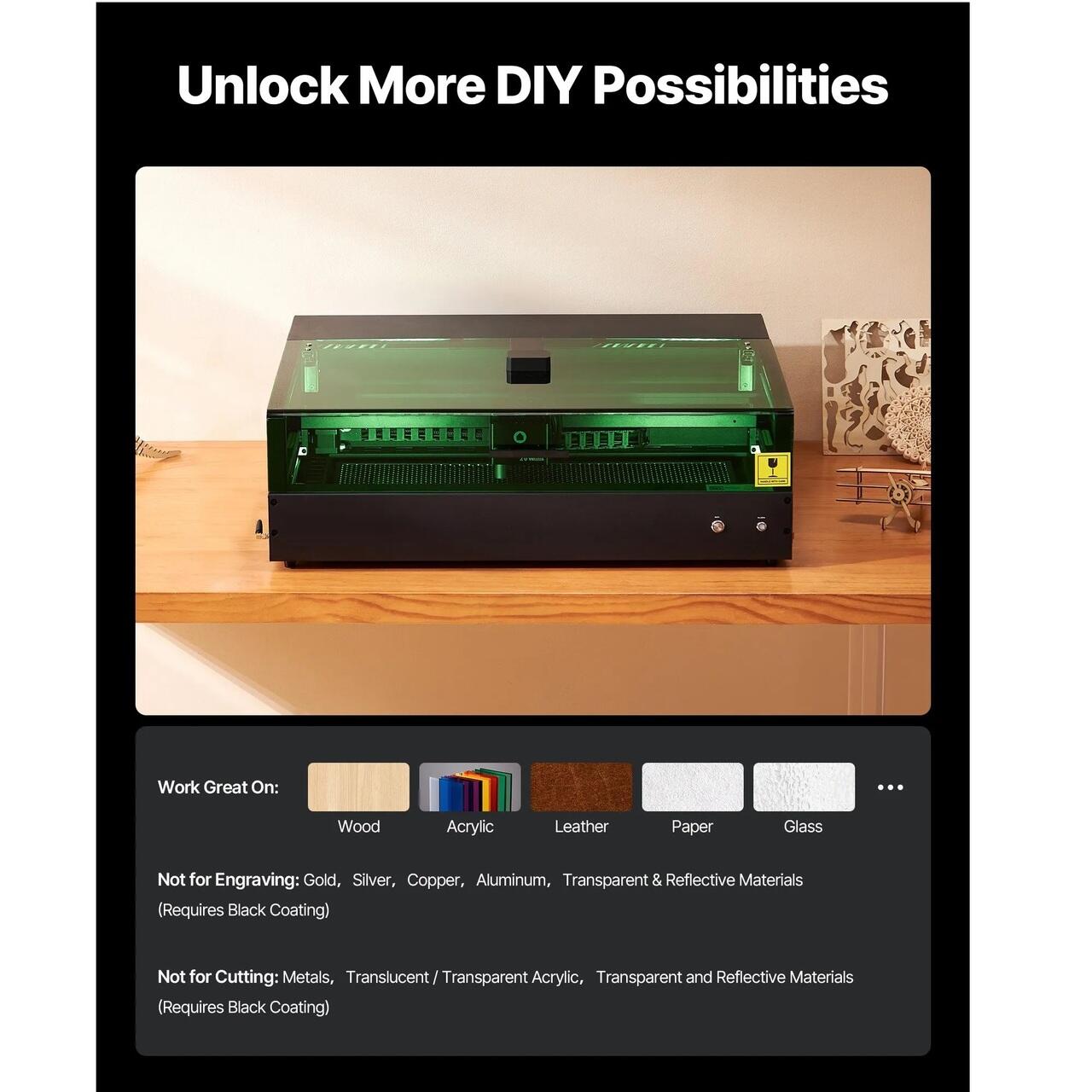 Suport versatil pentru materiale: Gravorul nostru laser cu dioda este ideal pentru lemn, piele, hartie, acril si multe altele. Nu este potrivit pentru gravarea aurului, argintului, cuprului, aluminiului, materialelor transparente si reflectorizante (necesita un strat negru). Nu poate taia metale, acrilic translucid/transparent, materiale transparente si reflectorizante (necesita un strat negru).