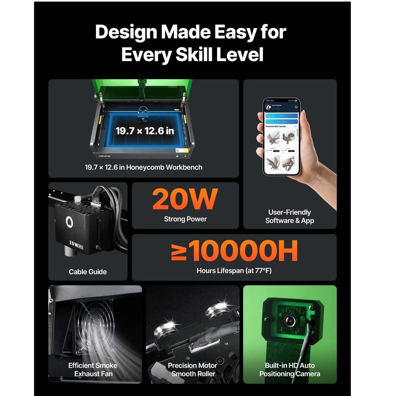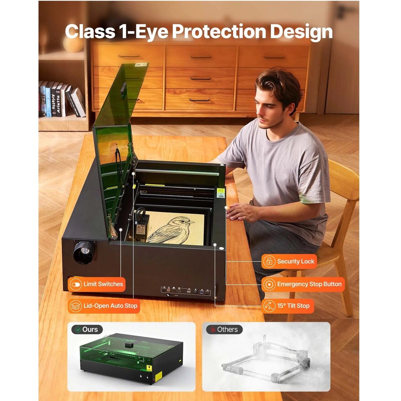 Productivitate remarcabila: Clasa laser: Clasa 1, Putere de iesire: 20000 mW. Cu viteze de pana la 36.000 mm/min si o zona de lucru de 19,7 x 12,6 in, acest gravator laser pentru lemn taie 0,3 inch de tei intr-o singura trecere, la fel de usor ca felierea untului.