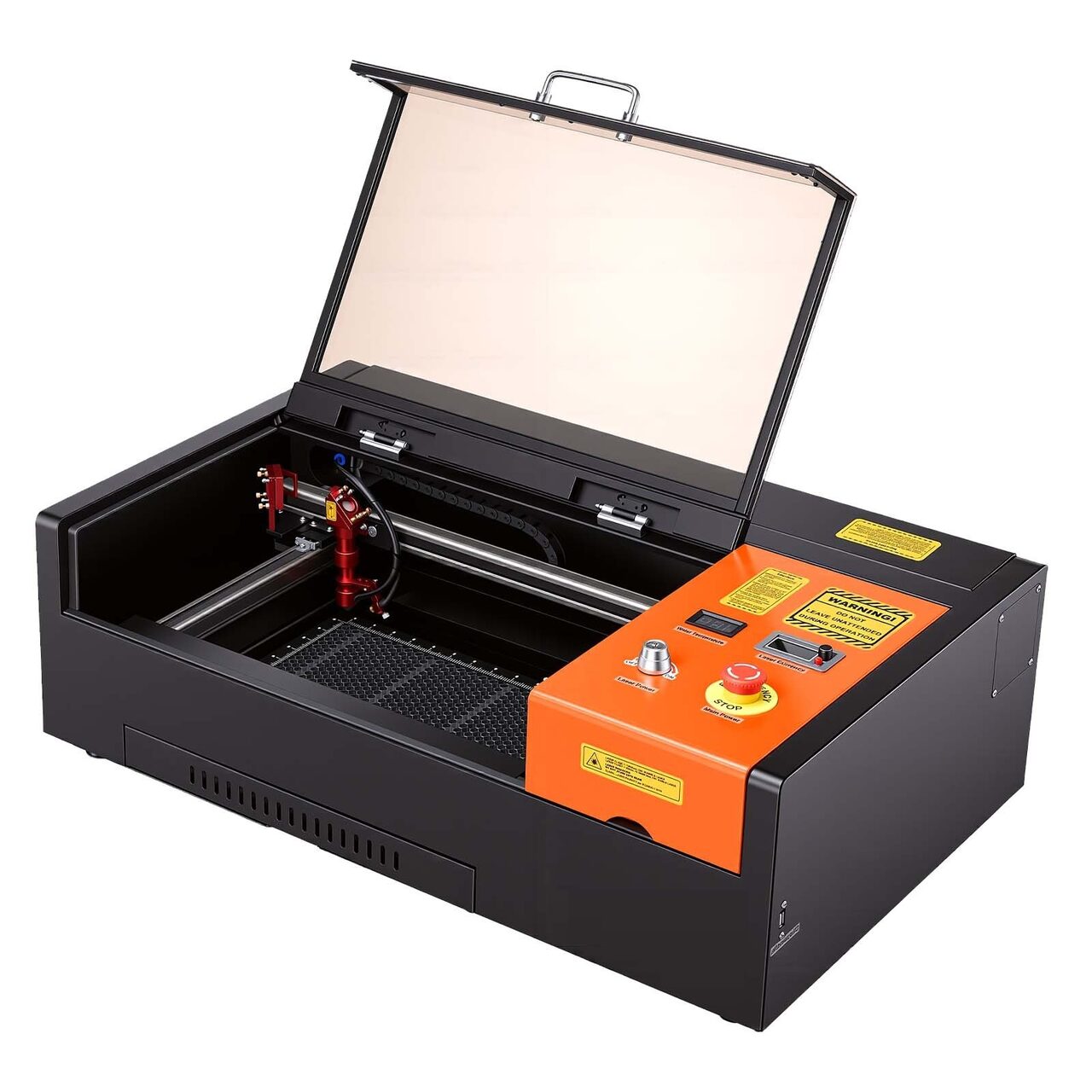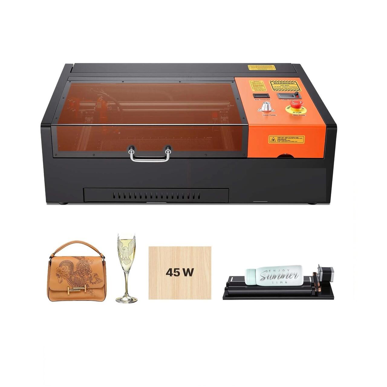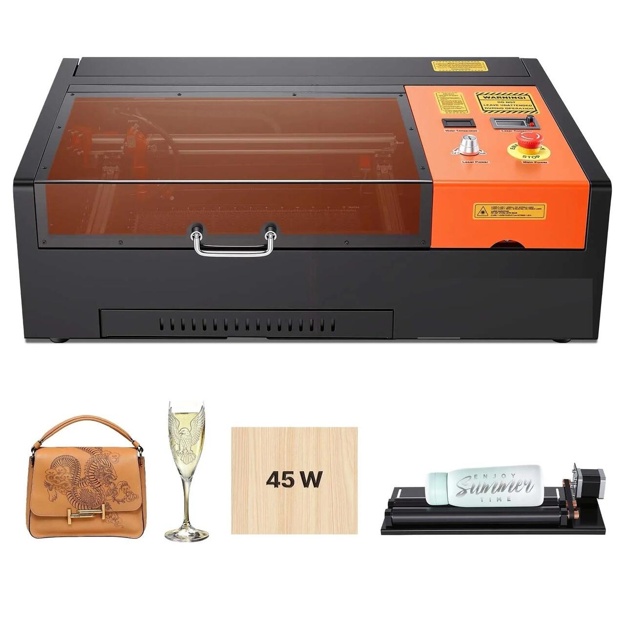 Gravura si taiere de inalta eficienta: Acest gravator laser CO2 de 45 W graveaza sau taie lemn, acrilic si alte materiale nemetalice cu margini fara bavuri. Recomandat pentru acrilic ≤ 5 mm si lemn ≤ 3 mm, atinge pana la 300 mm/s. Durata de viata a tubului laser: peste 3.500 de ore. Nota: nu este pentru gravarea metalelor, este potrivit doar pentru metale acoperite.