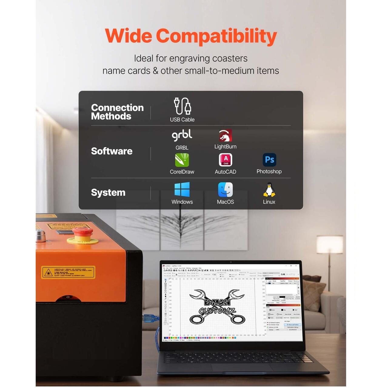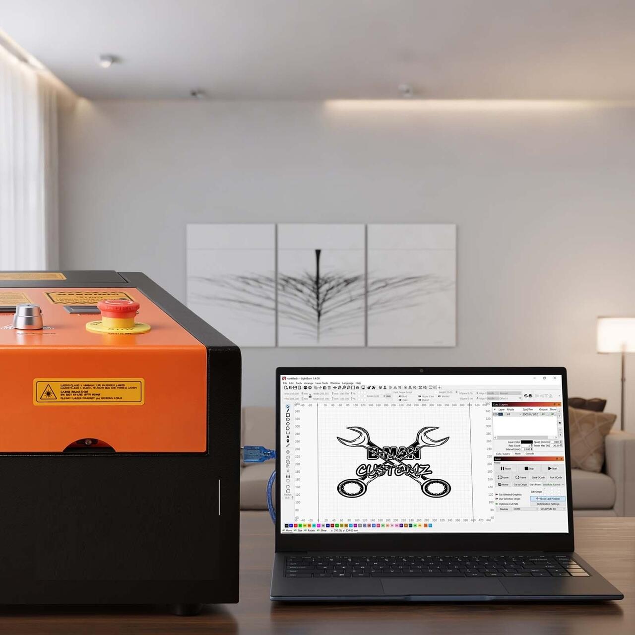 Compatibilitate larga: Functioneaza perfect cu Windows, macOS si Linux. Conectati-va prin USB sau cablu de alimentare pentru o operare usoara plug-and-play. Aceasta masina de gravat cu laser CO2 este complet compatibila cu LightBurn, GRBL, CorelDraw si AutoCAD.