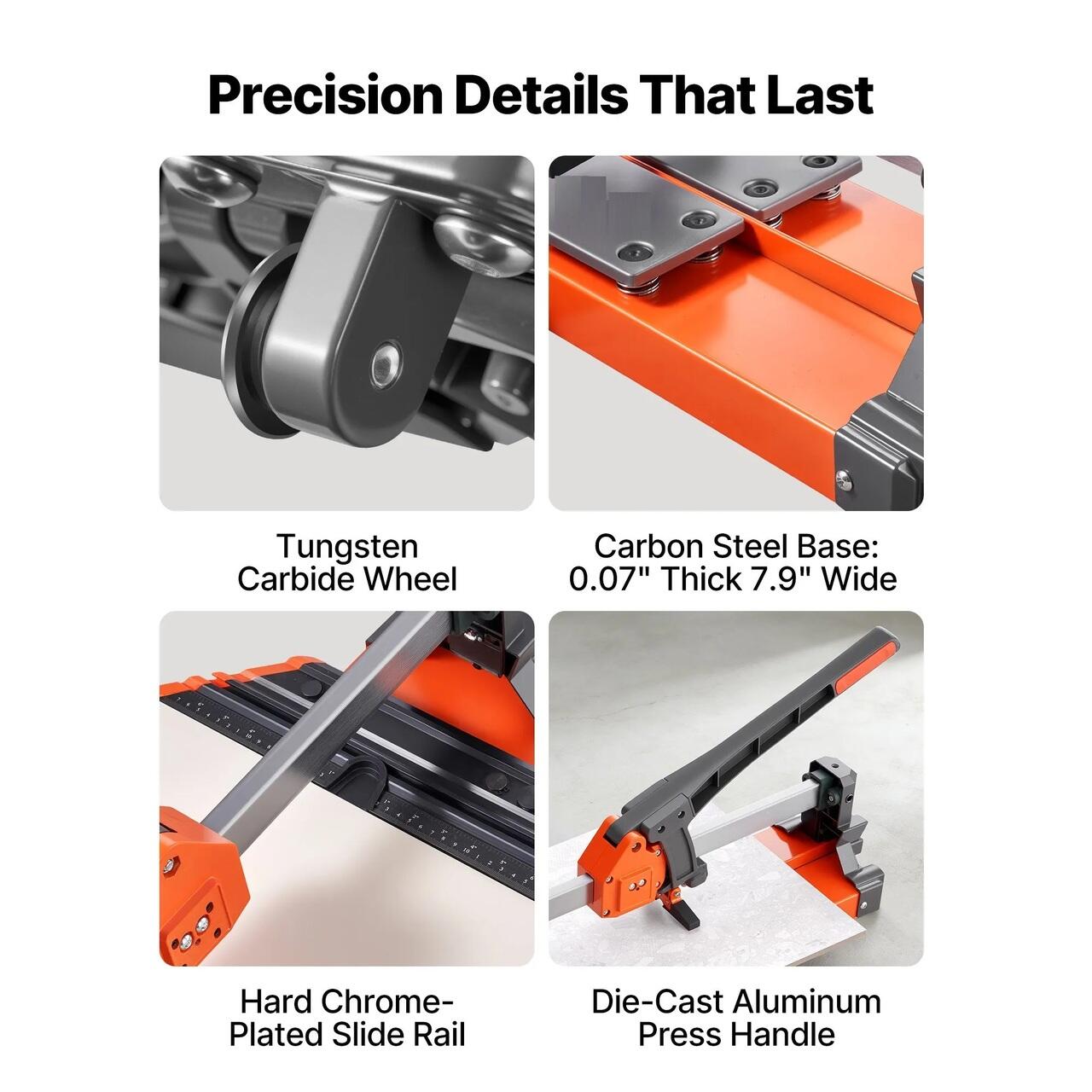 Construit pentru utilizare pe termen lung: Componente fabricate cu precizie pentru taierea zilnica. Printre masinile de taiat faianta fiabile, acesta dispune de o roata de taiat carbura de tungsten, o baza lata din otel carbon pentru stabilitate, o sina de ghidare pentru o deplasare lina si un maner din aluminiu pentru durabilitate.