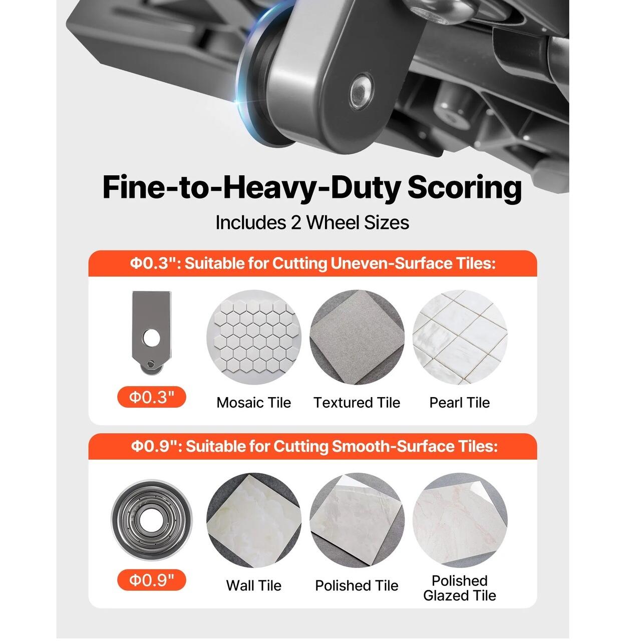 Doua dimensiuni de roti incluse: Abordati atat taieturi fine, cat si grele cu doua roti de taiere interschimbabile. Roata de 0,3 in se potriveste placilor mozaic si texturate, in timp ce roata de 0,9 in se potriveste placilor netede si lustruite.