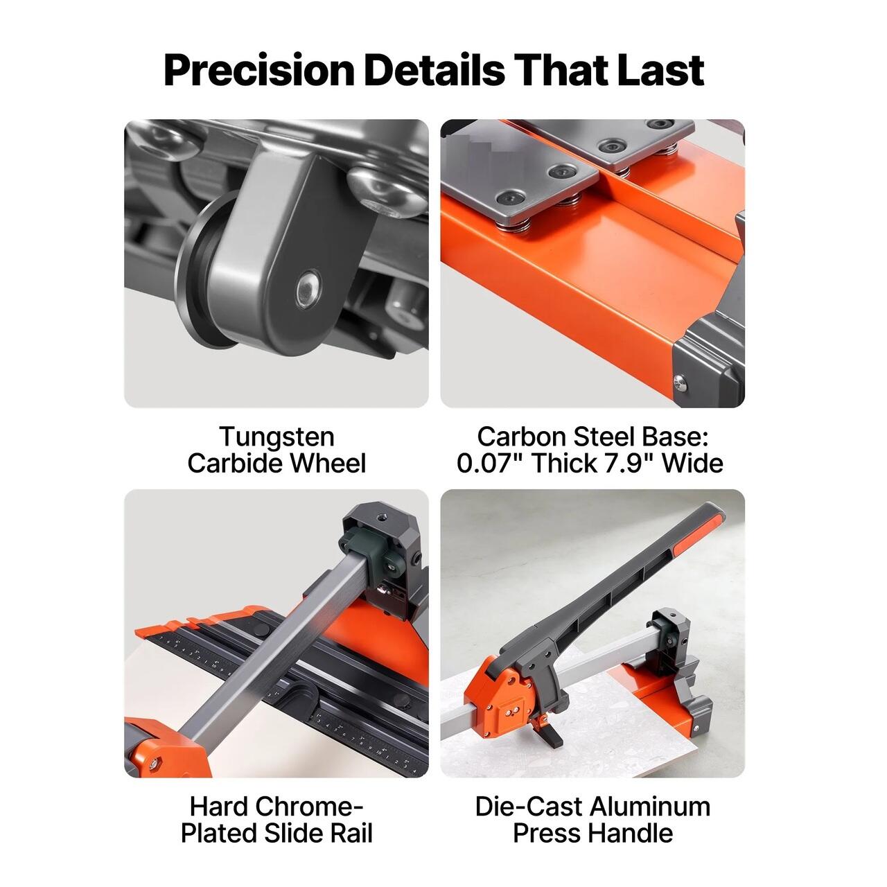 Construit pentru utilizare pe termen lung: Componente fabricate cu precizie pentru taierea zilnica. Printre masinile de taiat faianta fiabile, acesta dispune de o roata de taiat carbura de tungsten, o baza lata din otel carbon pentru stabilitate, o sina de ghidare pentru o deplasare lina si un maner din aluminiu pentru durabilitate.
