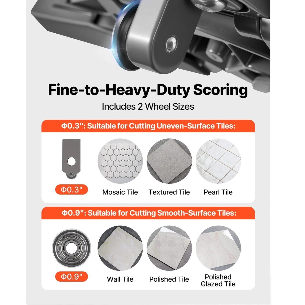 Doua dimensiuni de roti incluse: Abordati atat taieturi fine, cat si grele cu doua roti de taiere interschimbabile. Roata de 0,3 in se potriveste placilor mozaic si texturate, in timp ce roata de 0,9 in se potriveste placilor netede si lustruite.