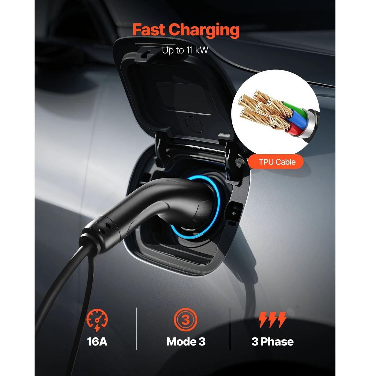 Incarcare rapida si puternica: Cu un cablu de 10 m, cablul prelungitor pentru incarcatorul EV suporta pana la 11 kW pentru reincarcari mai rapide, reducand timpul de asteptare la incarcator.