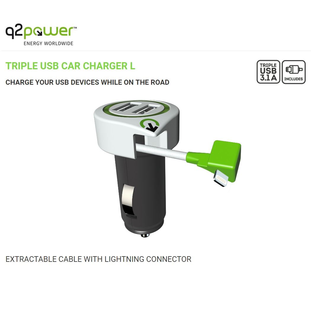 Incarcator auto Q2Power, 3.1A, 2xUSB, 1xLightning, compatibil iPhone, iPad, iPod