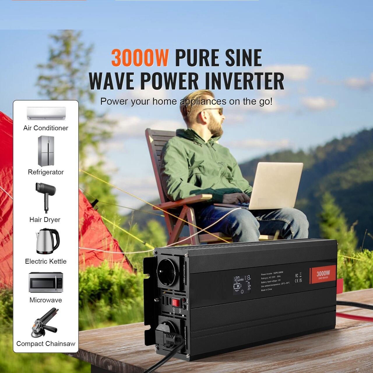 Invertor de putere cu unda sinusoidala pura: Transformati fara efort 12V DC in putere stabila de 230V AC. Cu o putere continua de 3000 W, o putere de varf de 6000 W si o eficienta la incarcare maxima de pana la 88%, invertorul nostru de putere este alegerea dvs. pentru echipamentele de uz casnic mari, cum ar fi frigidere, cuptoare, aparate de cafea, ventilatoare, uscatoare de par, ceainice etc. (Puterea totala dintre dispozitivele conectate nu trebuie sa depaseasca puterea nominala a invertorului. Pentru nevoi mai mari de energie, luati in considerare modelele noastre cu sarcina mare