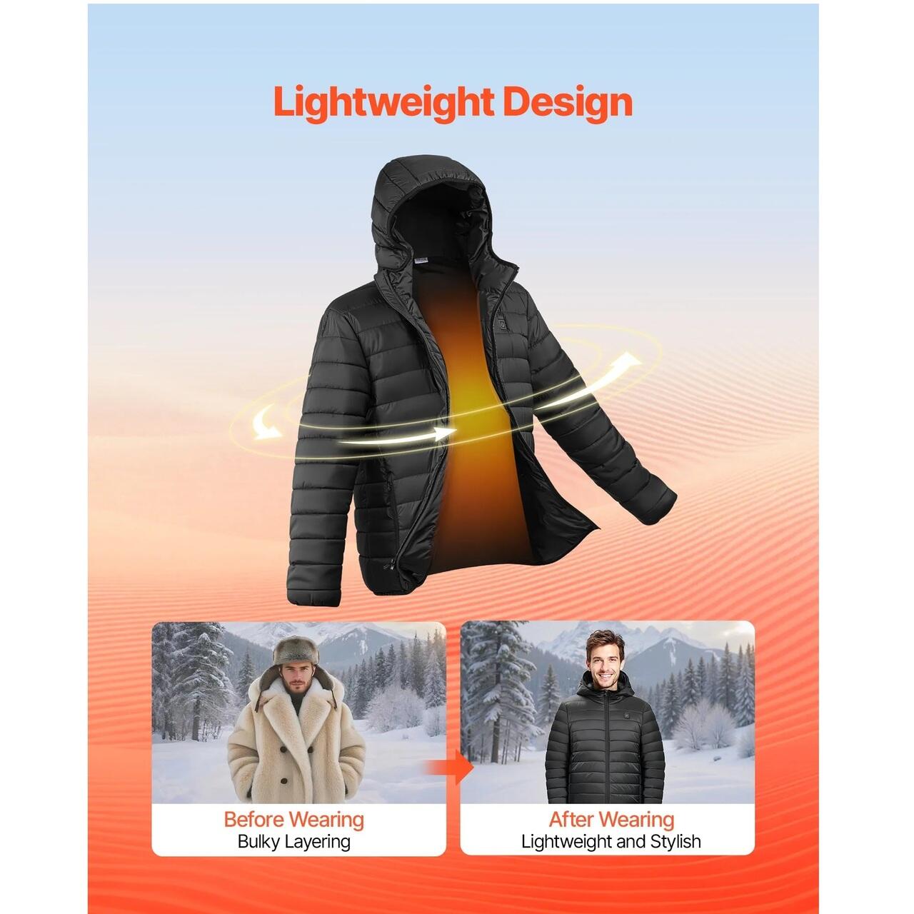 Design usor: Cantarind doar 0,7 kg - 7,9 kg, inclusiv bateria, aceasta jacheta incalzita de iarna este calduroasa, dar usoara, permitand miscare flexibila si reducand nevoia de straturi grele pe vreme rece.