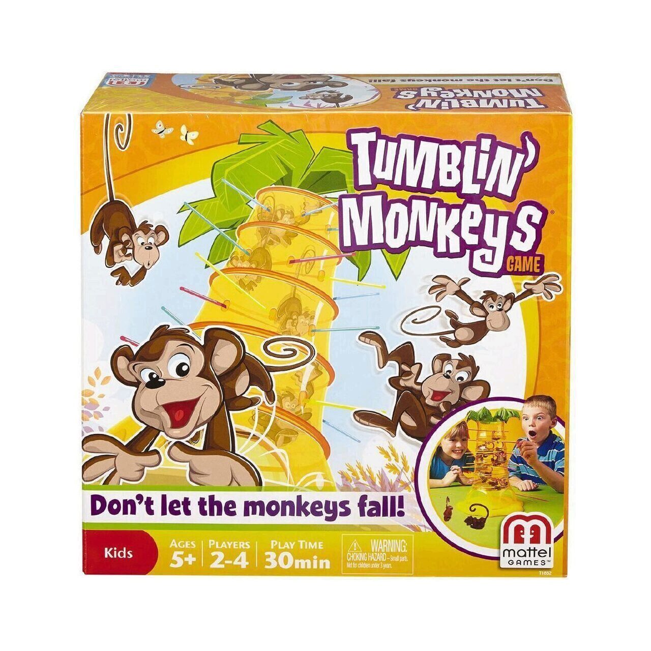 Jucătorul care rostogoleste cele mai puține maimuțe câștigă! Cum nu este necesară citirea pentru a se juca, jocul Tumblin 'Monkeys este perfect pentru copiii mai mici. Jocul vine cu un palmier de plastic galben strălucitor, astfel încât să puteți vedea maimuțele  în timp ce încercați să-i prindeți cozile cretate pe bastoane de plastic. De asemenea, sunt incluse 30 de maimuțe, 30 de bețe colorate multiple și un zar special. De la 2  la 4 jucători. Un joc clasic de îndemânare și acțiune ușor de învățat și distractiv de jucat! Jucătorii plasează maimuțele în copac și mișcă bețele în funcție de culoarea colorată a zarului. Jucătorul care colectează cel mai puțin număr de maimuțe, câștigă! Nu este necesară citirea, deci este perfectă pentru copiii mai mici. Vine cu un copac, 30 de maimuțe, 30 de bețe în trei culori și un zar special. Pentru doi-patru jucători