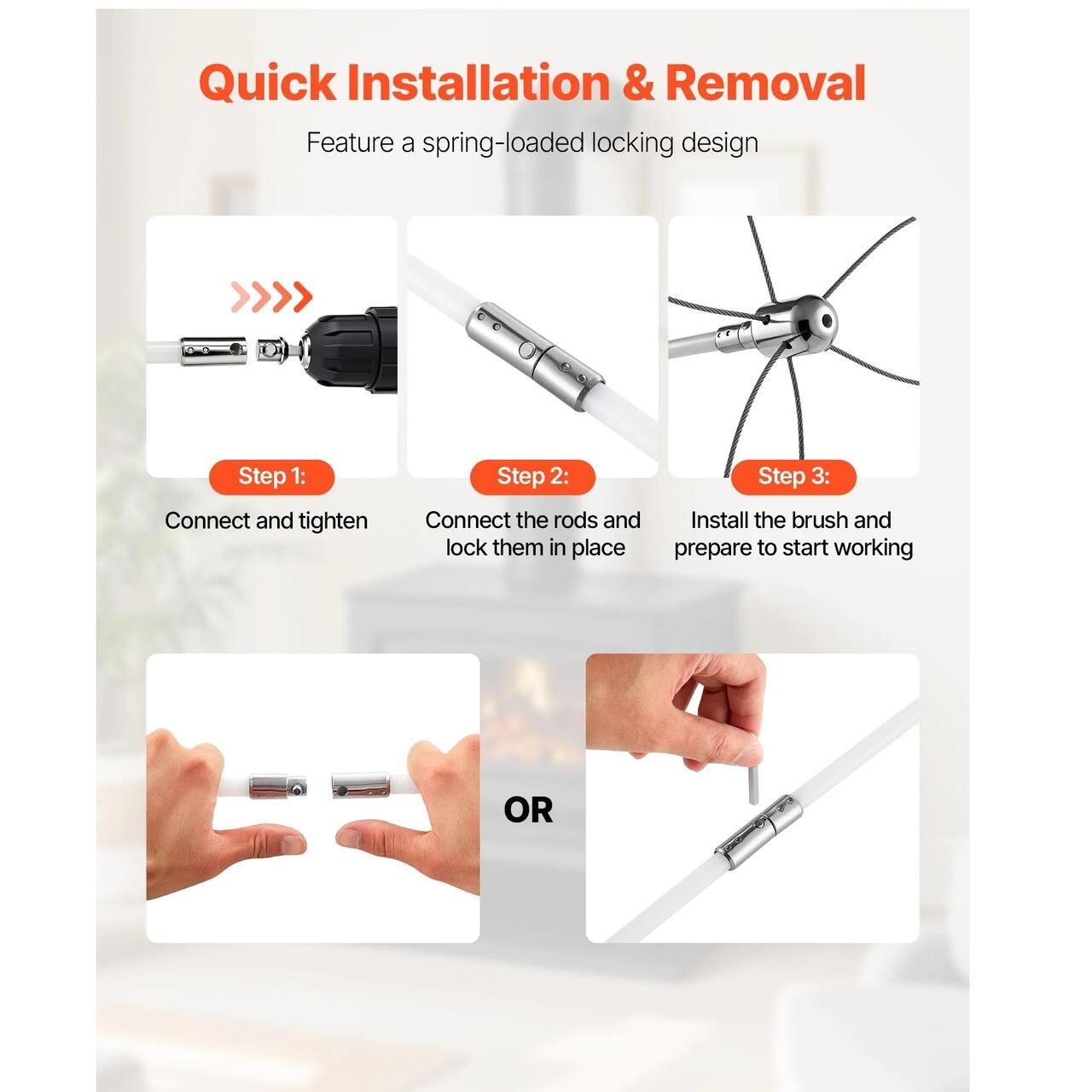 Conectare sigura si usoara: Cu un sistem de blocare cu buton cu arc, aceasta perie pentru cos de fum face conectarea si deconectarea fara efort. Designul sau asigura ca, indiferent de directia de rotire, tija ramane ferm fixata in pozitie, eliminand orice risc de slabire sau separare in timpul curatarii.