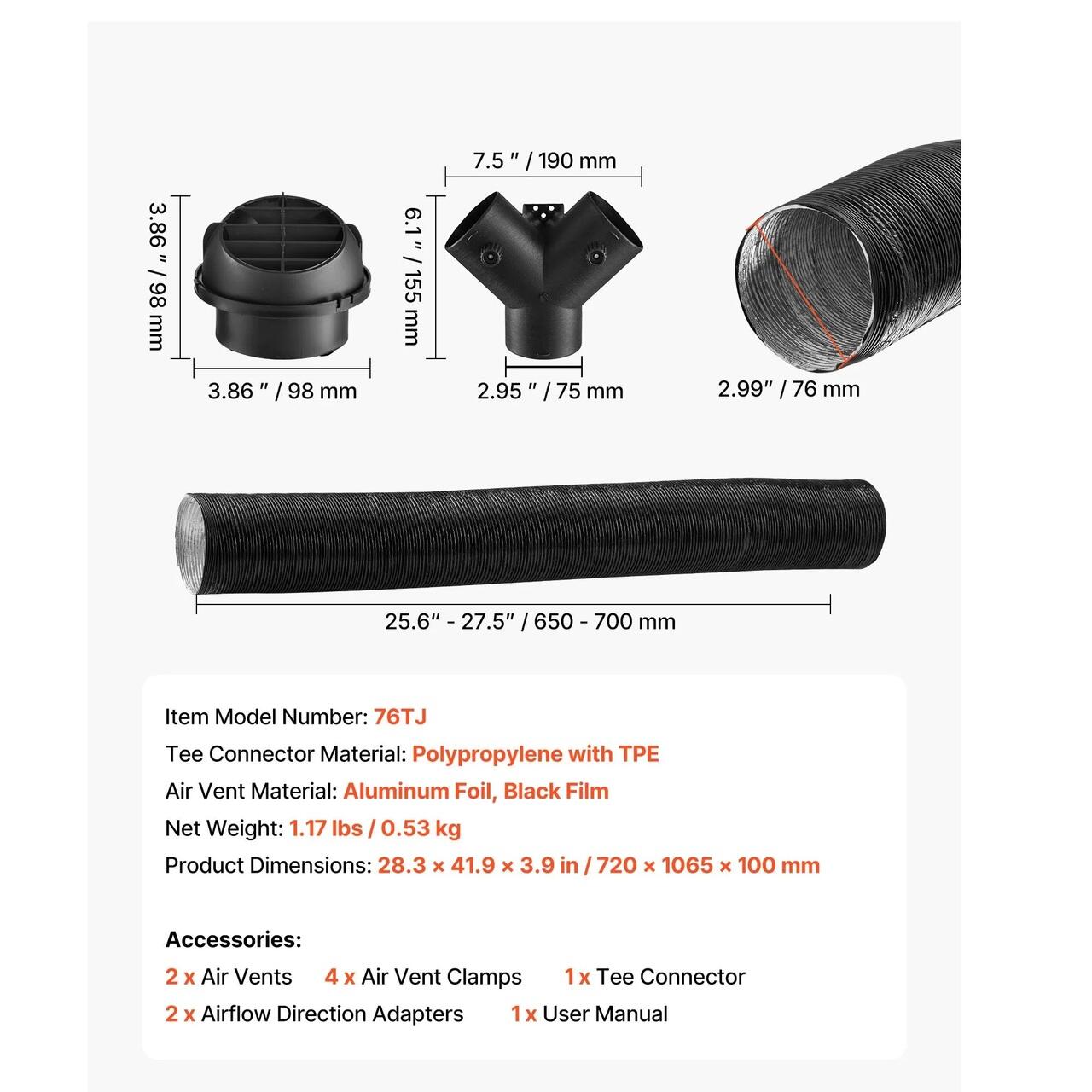 Robust si durabil: Conectorul in Y pentru furtunul de aer al incalzitorului diesel VEVOR este fabricat din polipropilena durabila, TPE si folie de aluminiu. Isi mentine rezistenta, stabilitatea termica si rezistenta la intemperii, asigurand performante de incalzire fiabile in timpul utilizarii pe termen lung.