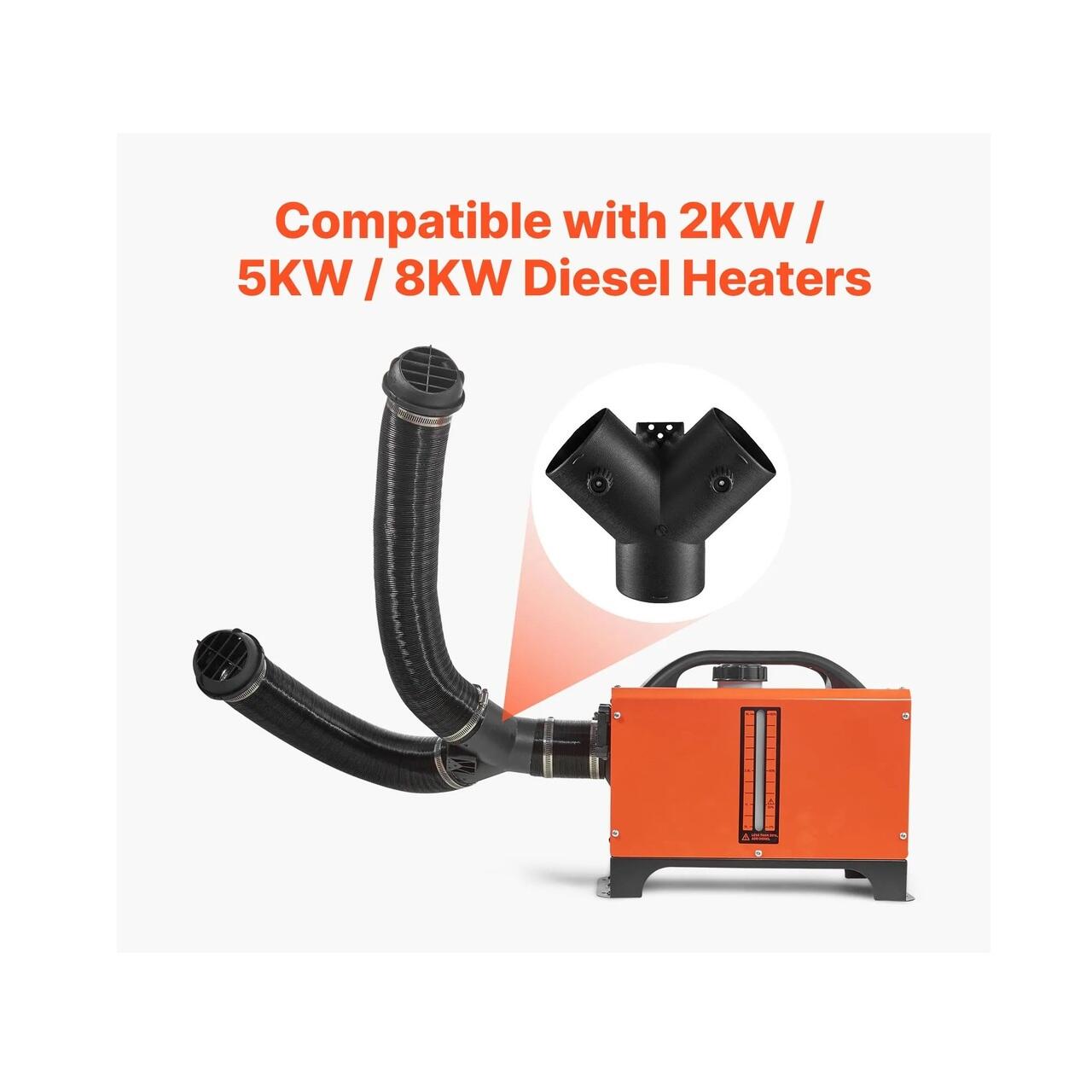 Set complet de conducte: Pachetul nostru include un conector de evacuare cu ramificatie in Y, o clema de furtun, 2 conducte de aer, 2 adaptoare de debit si 4 cleme. Este conceput pentru a oferi o instalare si o intretinere usoara, imbunatatind in acelasi timp gestionarea fluxului de aer cald in sistemele de incalzire cu motorina.