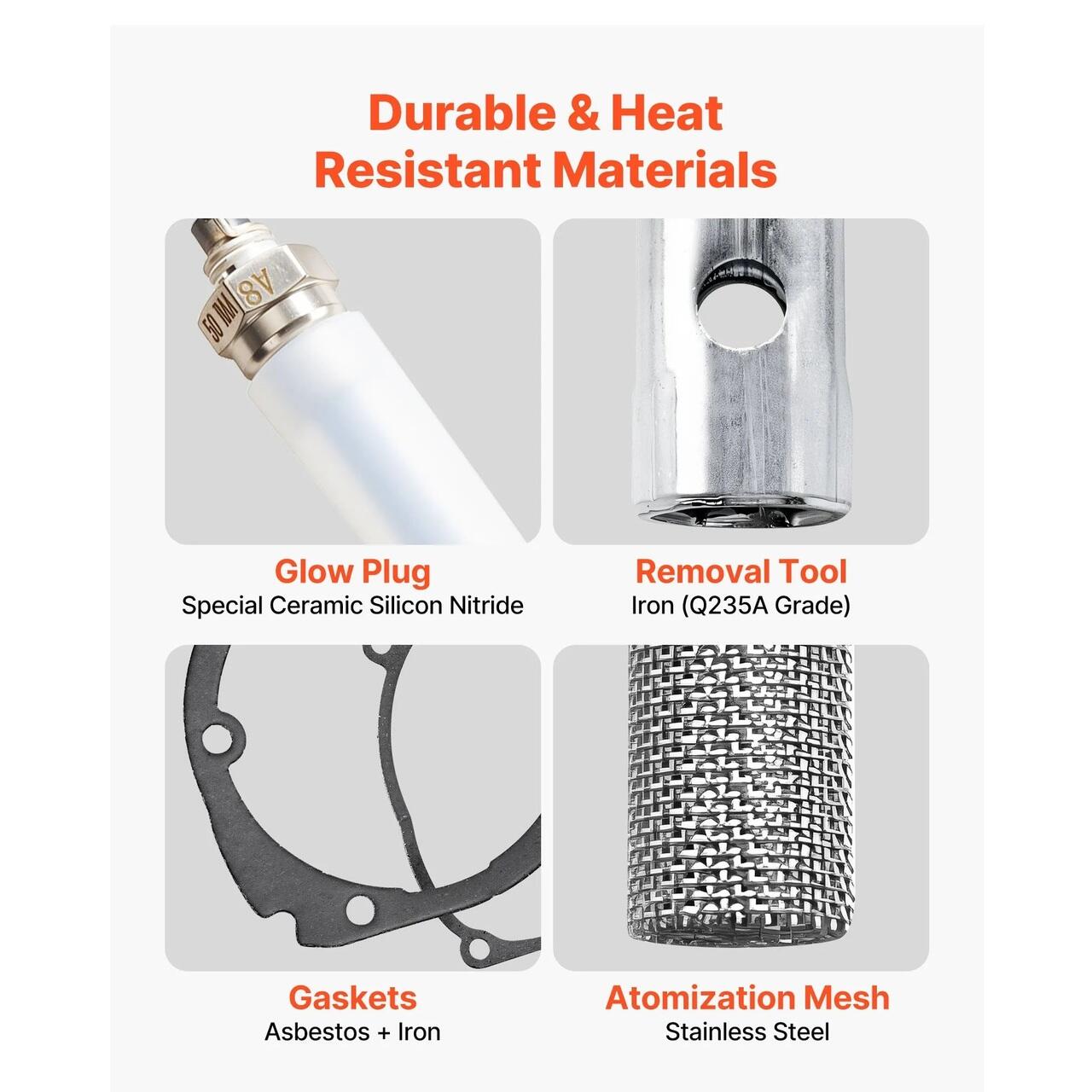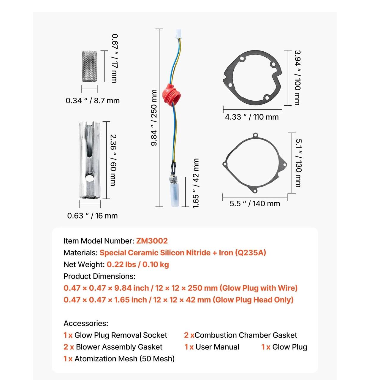 Kit complet de intretinere: Kitul nostru de reparare a bujiei incandescente ofera toate piesele esentiale de care aveti nevoie: o bujie incandescenta, o priza de demontare, 2 X  garnitura si o plasa de atomizare. Acesta ofera performante fiabile si face instalarea sau intretinerea incalzitoarelor diesel simpla si eficienta.