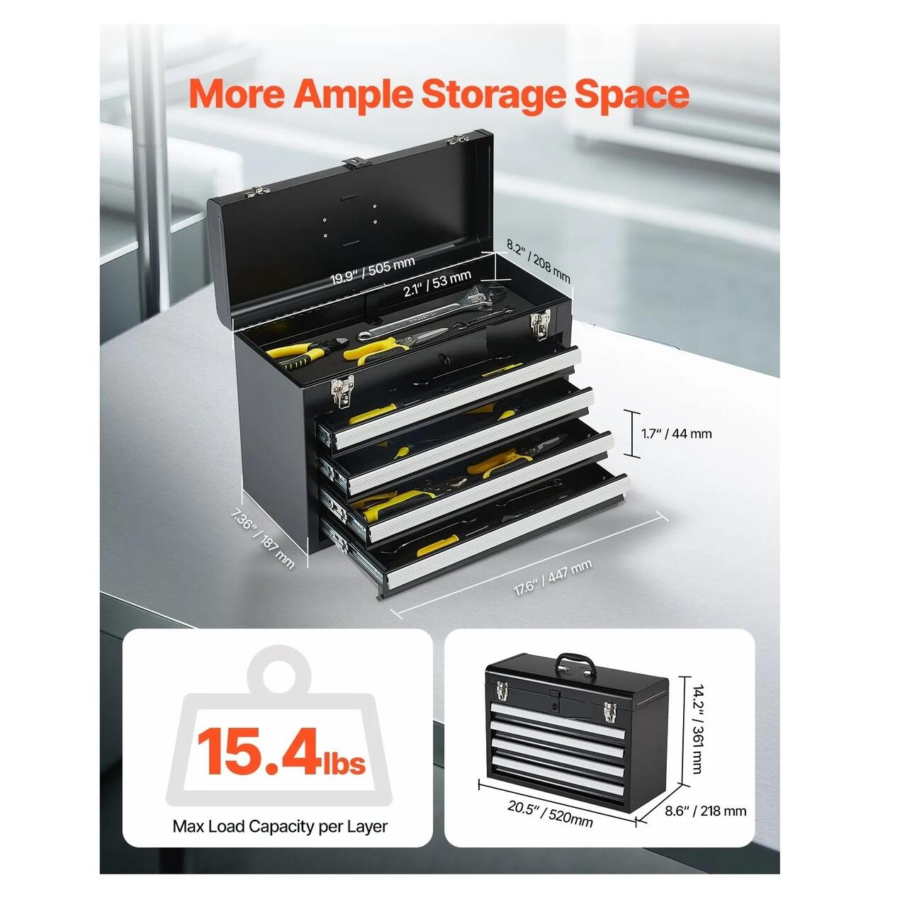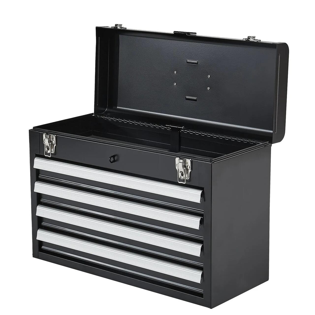 Spatiu amplu de depozitare: Cutia metalica portabila pentru scule masoara 52 x 21 x 36 cm si cantareste 9,3 kg, fiind ideala pentru transportul sculelor in timpul deplasarii sau pentru depozitarea lor in portbagajul masinii. Dispune de 1 cutie superioara (45 x 20 x 5 cm) si 3 sertare (45 x 18 x 4 cm), fiecare sertar putand suporta pana la 6,8 kg, oferind mult spatiu de depozitare.