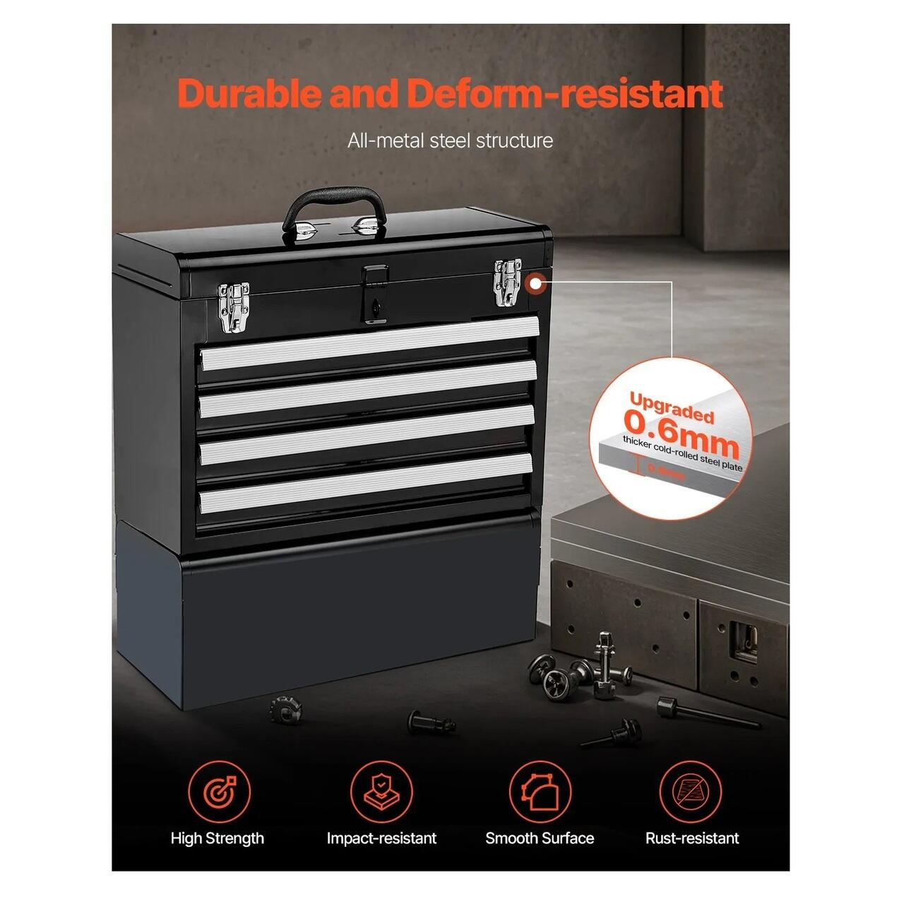 Robusta si durabila: Construita din otel imbunatatit cu grosimea de 0,6 mm, aceasta cutie de scule cu sertare este conceputa pentru a rezista, oferind o rezistenta ridicata la deformare si impact. Suprafata vopsita in camp electrostatic imbunatateste semnificativ rezistenta la rugina, fiind ideala pentru medii dificile. Suprafata metalica neteda este, de asemenea, usor de curatat si intretinut, oferind o utilizare fara probleme.