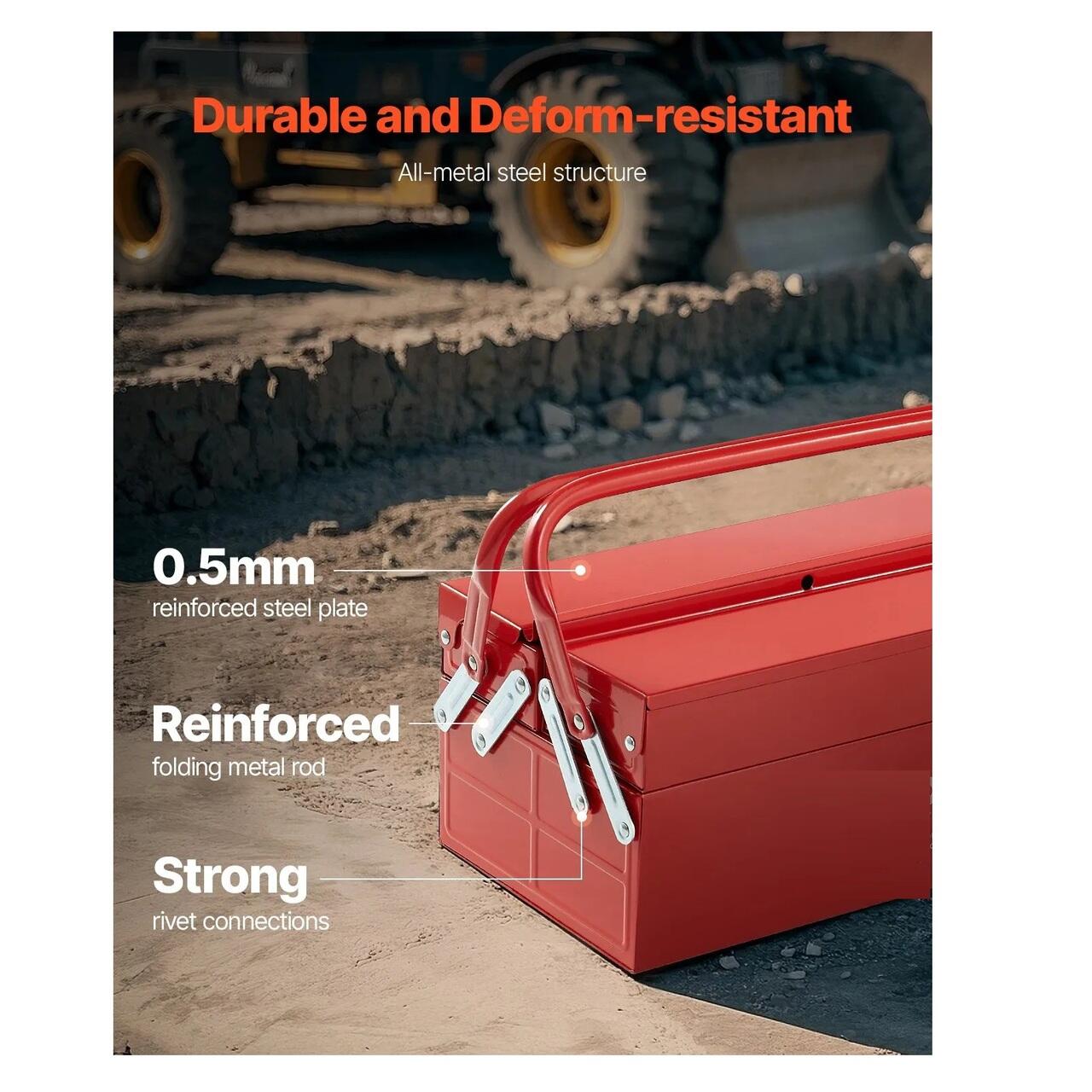 Robusta si durabila: Construita din otel imbunatatit cu grosimea de 0,5 mm, aceasta cutie de scule pliabila din otel este conceputa pentru a rezista. Este rezistenta la deformare si impact, asigurand o utilizare indelungata. Suprafata vopsita in camp electrostatic imbunatateste semnificativ rezistenta la rugina, fiind ideala pentru medii dificile. Suprafata metalica neteda este usor de curatat, oferind o utilizare convenabila si fara probleme.