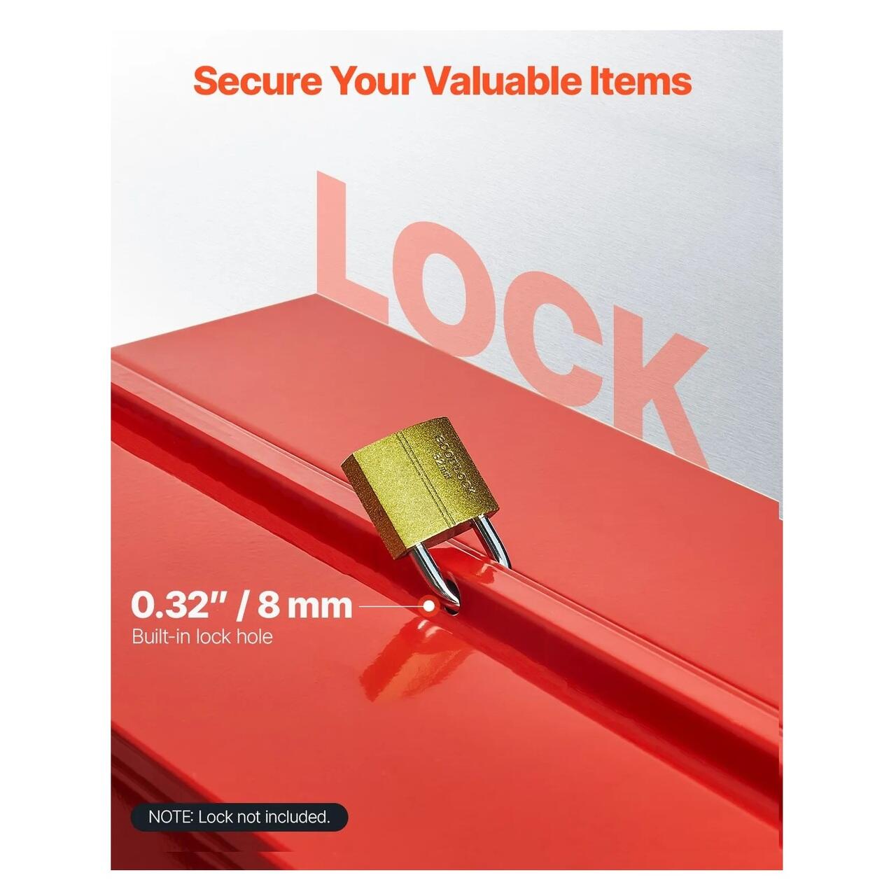 Securitate sporita: Trusa de scule cu consola are un orificiu de blocare incorporat in partea superioara, permitandu-va sa adaugati un lacat pentru securitate suplimentara. Acest lucru ajuta la securizarea obiectelor de valoare si la evitarea furtului. (Nota: Orificiul de blocare este compatibil cu un lacat de 0,32 inch, care nu este inclus.)