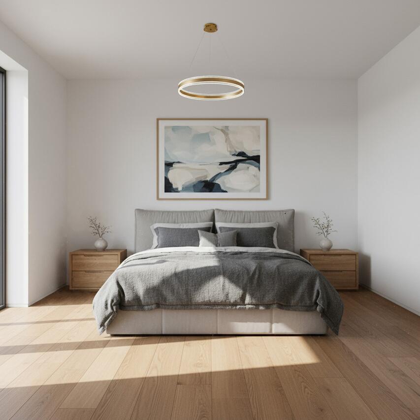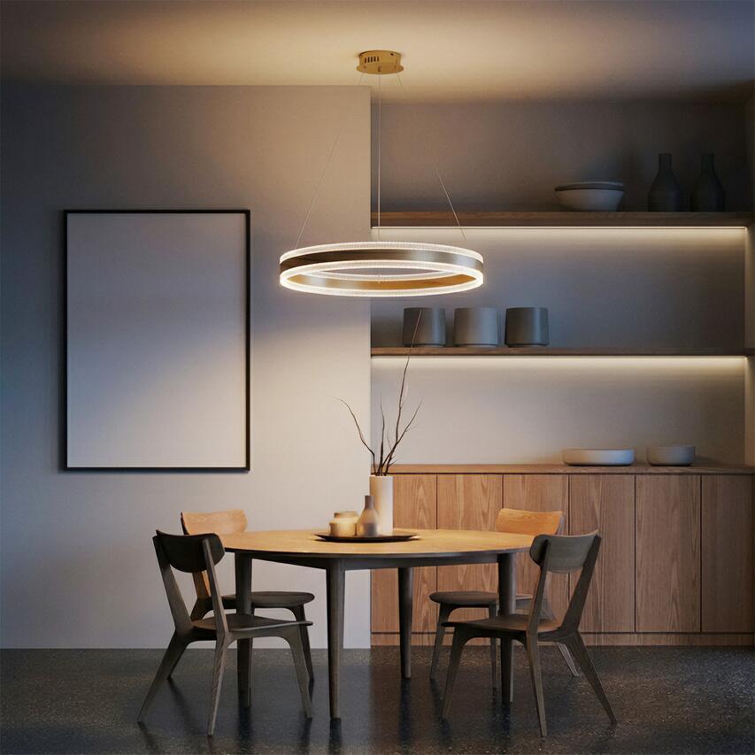 Lampa suspendata Horoz SAMIRA 70W este un corp de iluminat premium in forma de inel, care combina designul minimalist cu un finisaj auriu luxos. Cu un diametru de 400 mm si o putere de 70W, ofera un flux luminos de 4900 lm (echivalent 560W), fiind ideala pentru livinguri, dormitoare sau spatii elegante. Constructia din aluminiu, fier si material PS asigura durabilitate si disipare eficienta a caldurii. Principalul avantaj este telecomanda inclusa, care permite control complet al luminii. Aceasta ofera reglare continua a intensitatii si selectarea temperaturii de culoare datorita tehnologiei 3CCT (3000K–6500K). Suspensia reglabila pana la 1000 mm permite montaj flexibil.