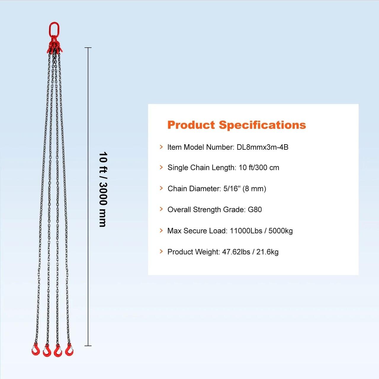 Capacitate de incarcare de 5.444 kg: Lungimea lantului: 3 m. Diametrul lantului: 1.66 cm. Capacitate maxima de lucru: 5.444 kg. Puteti utiliza lanturile noastre de ridicare in usurinta, cu un coeficient de siguranta ridicat.