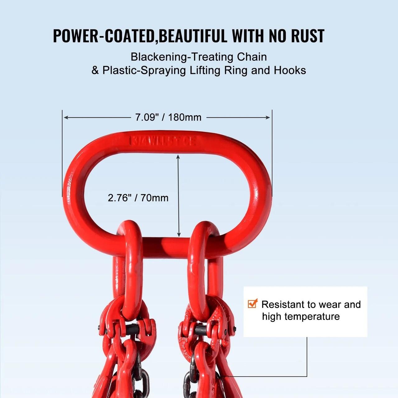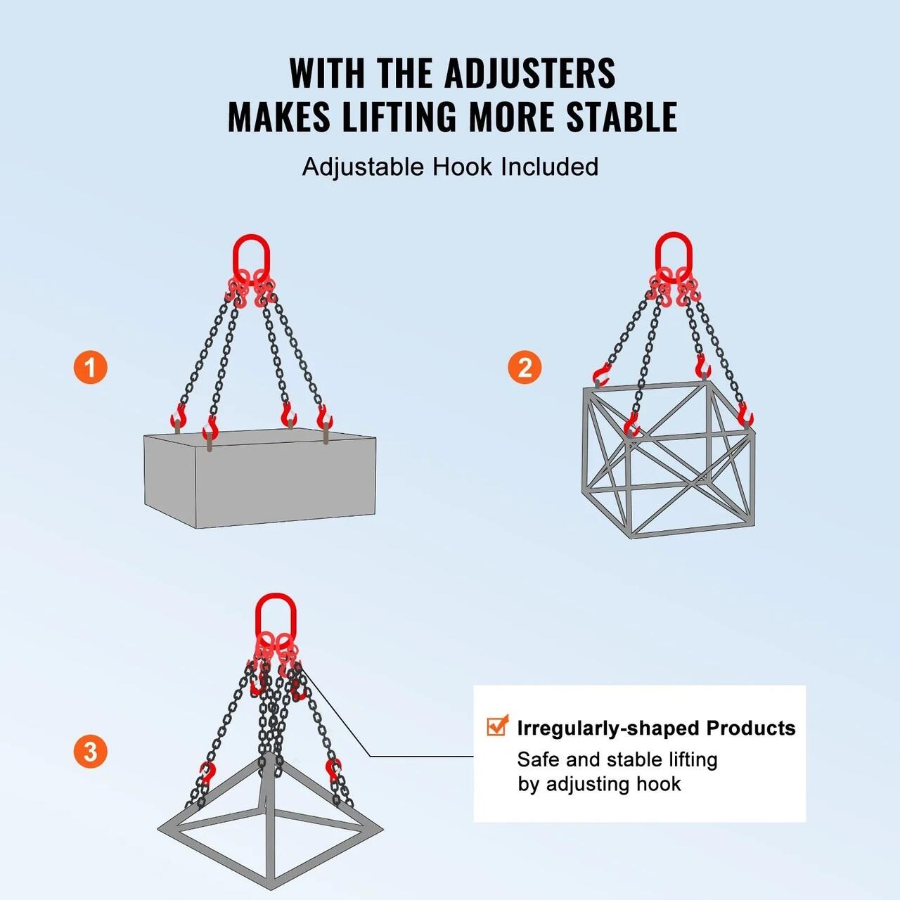 Cu patru dispozitive de reglare: Lanturile noastre de ridicare sunt echipate cu patru dispozitive de reglare, puteti ajusta lungimea lantului prin intermediul acestora. Astfel, acesta va fi mai sigur si mai stabil atunci cand ridicati obiecte neregulate.