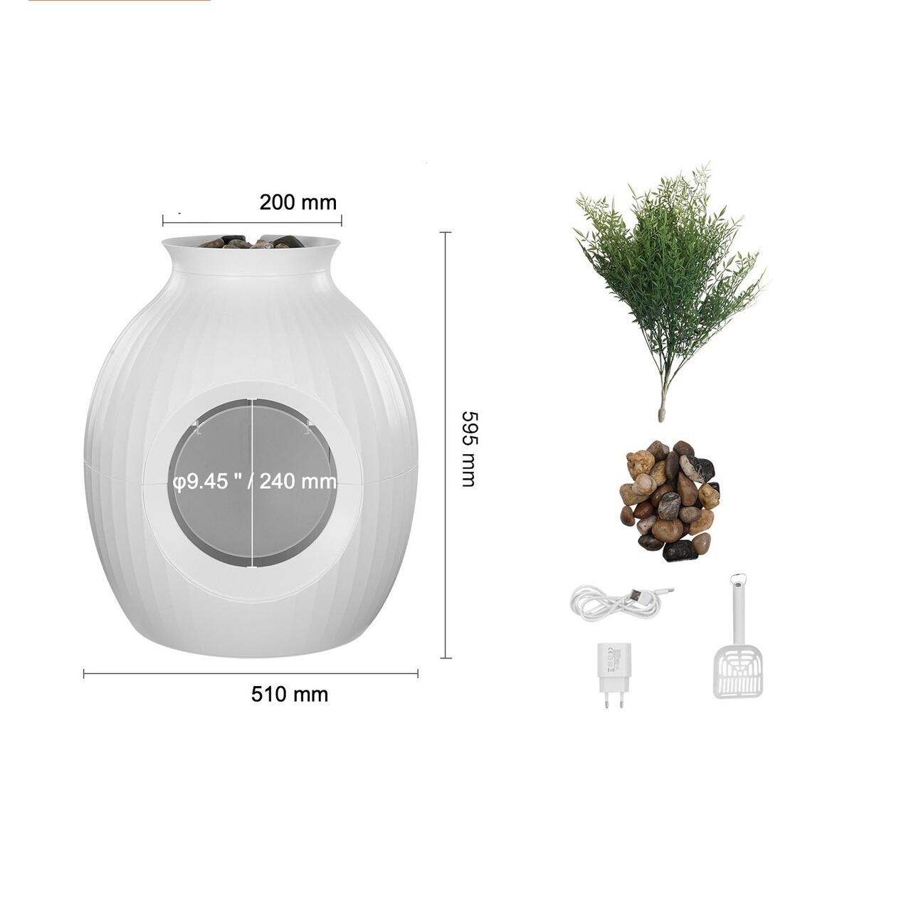 Ce veti obtine: 1 x carcasa pentru cutie de gunoi pentru pisici pentru plante, 1 x planta artificiala (Nandina), 1 x adaptor de alimentare, 1 x cablu de incarcare USB, 1 x cobblestone, 1 x scooper pentru asternut pentru pisici, 1 x manual de utilizare .