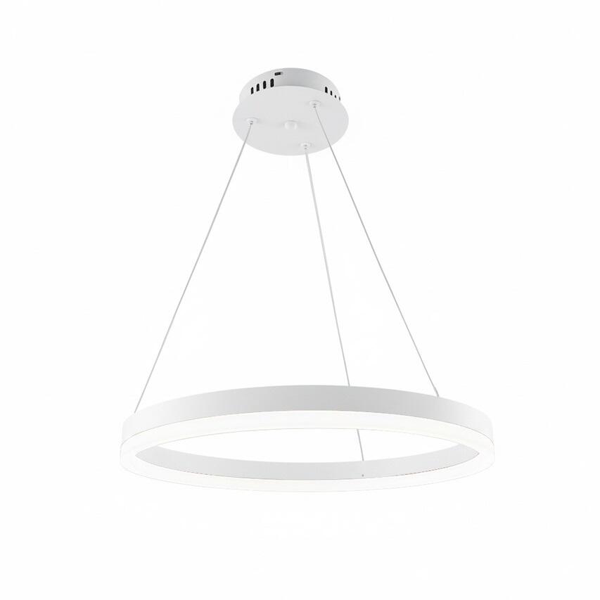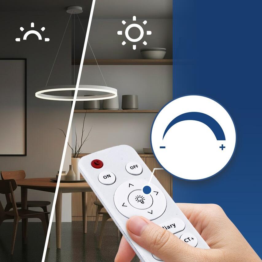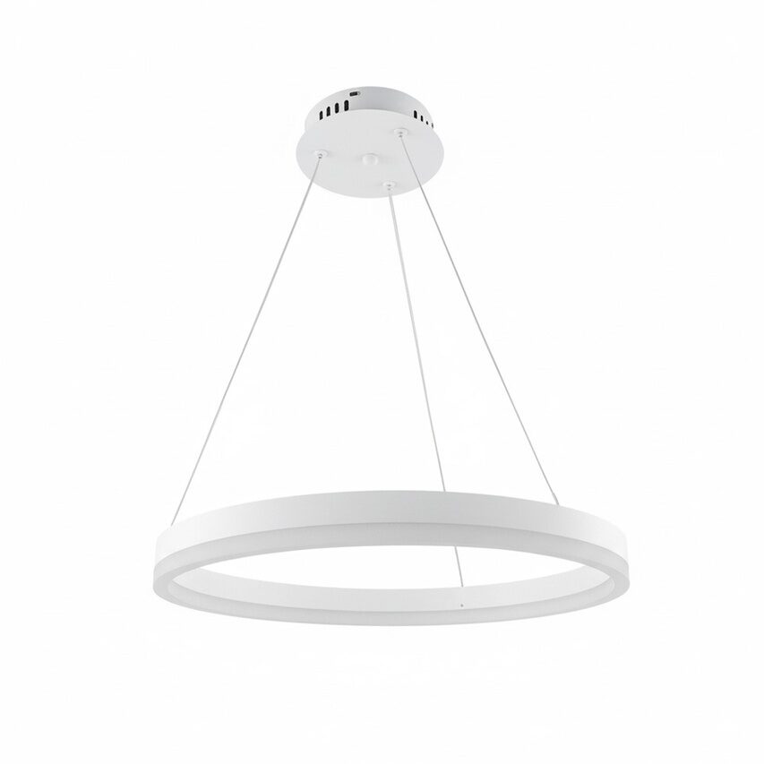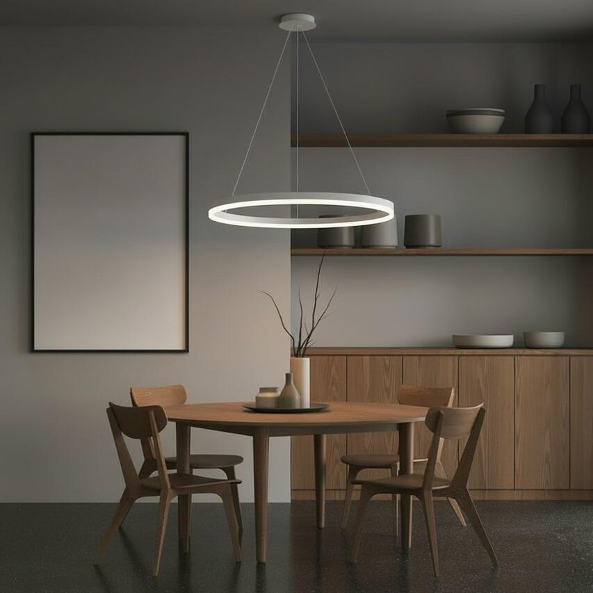 Lampa suspendata LED 35W este o alegere ideala pentru cei care cauta iluminat modern sub forma unui inel luminos cu diametrul de 400 mm. Realizata din aluminiu, fier si material PS, se remarca prin constructia usoara si finisajul alb elegant. Datorita suspensiei reglabile (max. 1000 mm), poate fi pozitionata cu precizie deasupra mesei, a insulei de bucatarie sau in centrul livingului. Un avantaj major al modelului este telecomanda inclusa, care permite controlul fara a folosi intrerupatorul de perete. Cu ajutorul acesteia se poate regla intensitatea luminii si temperatura de culoare (3CCT): de la alb cald (3000K), la alb neutru (4000K) pana la alb rece (6500K). Modulul LED SMD integrat ofera un flux luminos de 2450 lm la o putere de 35W, echivalentul unei surse traditionale de 280W. O solutie eleganta si practica pentru iluminatul zilnic.