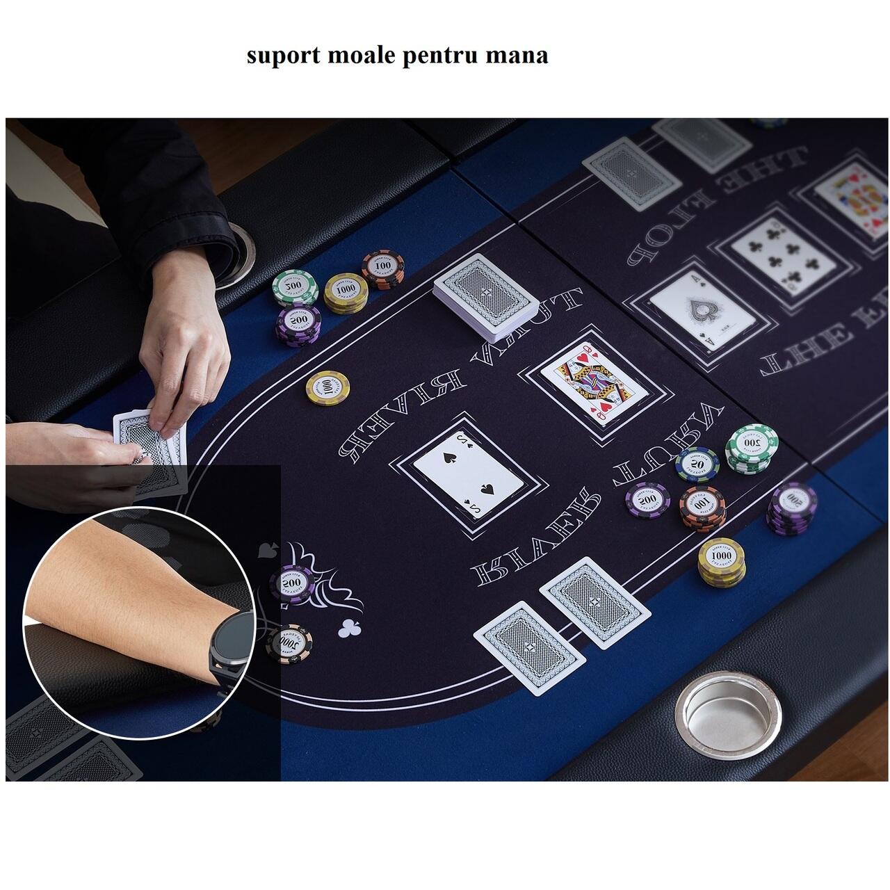 Blat din pasla neteda si fara riduri: Blatul mesei din pasla este neted si fara riduri, realizat din material rezistent la uzura. Asigura un joc fara probleme, fara probleme atunci cand verificati cartile, manipulati jetoanele sau va dezvaluiti mana.