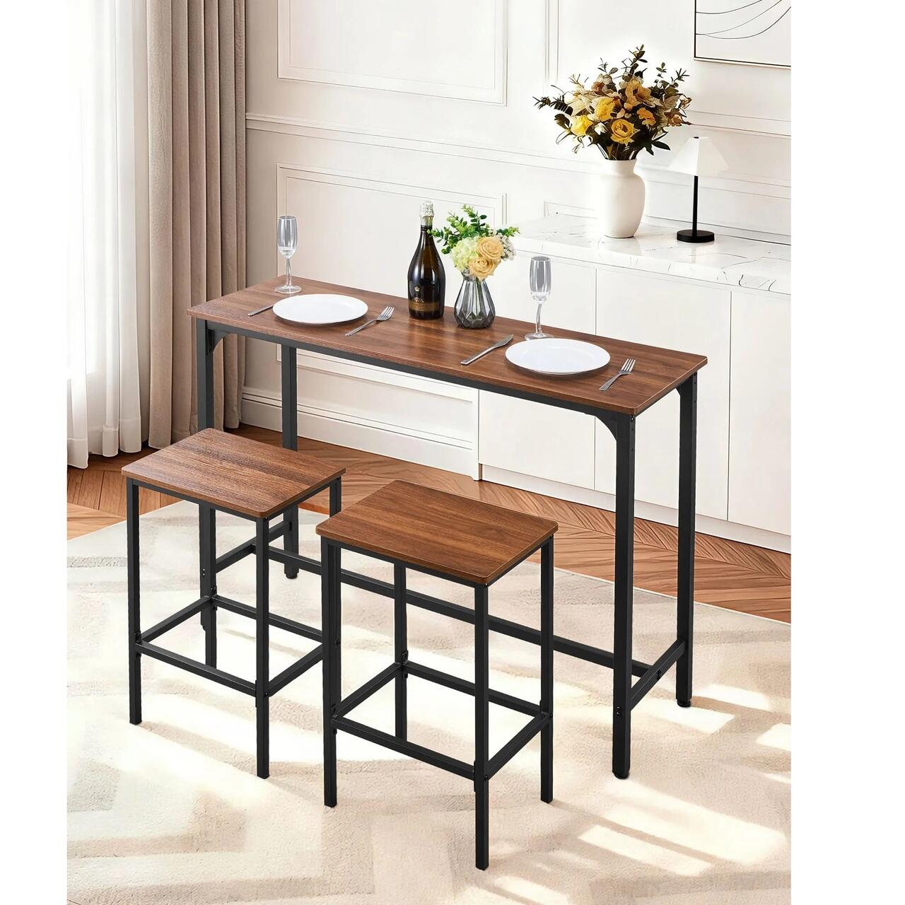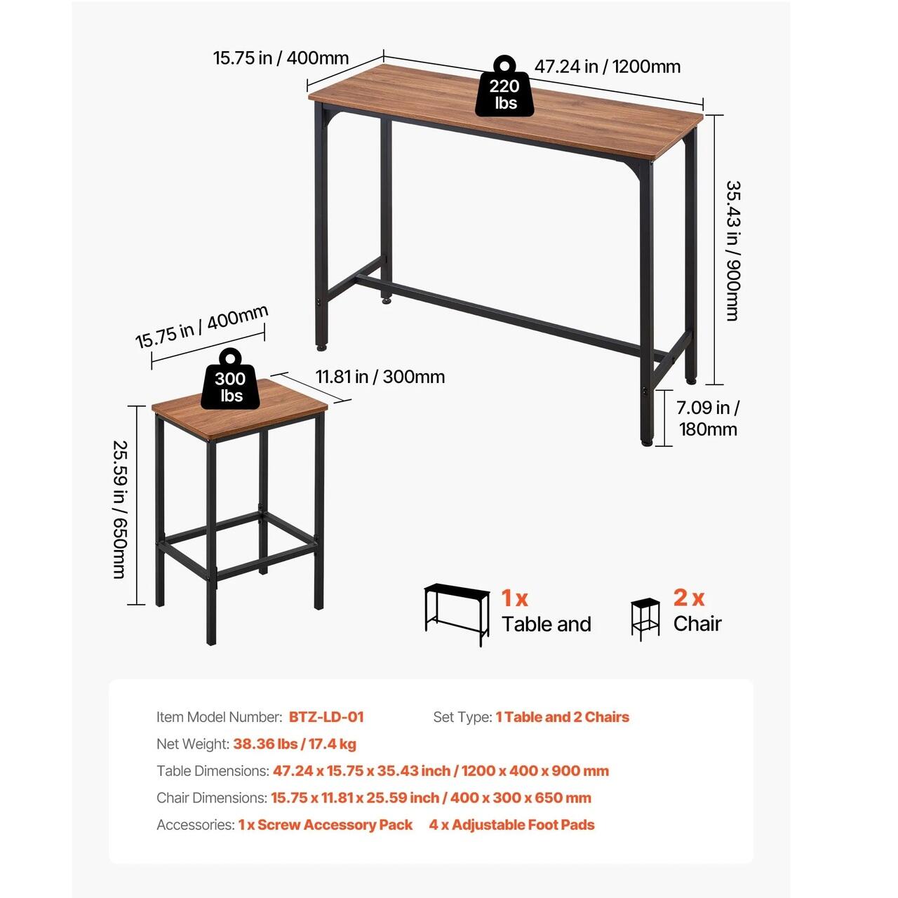Set masa si scaune 3 piese: Masa noastra dreptunghiulara de pub cu scaun include 1 masa (47,24 x 15,75 x 35,43 in / 1200 x 400 x 900 mm) si 2 scaune fara spatar (15,75 x 11,81 x 25,59 in / 400 x 300 x 650 mm). Potrivit pentru doua persoane, setul ofera un blat spatios.