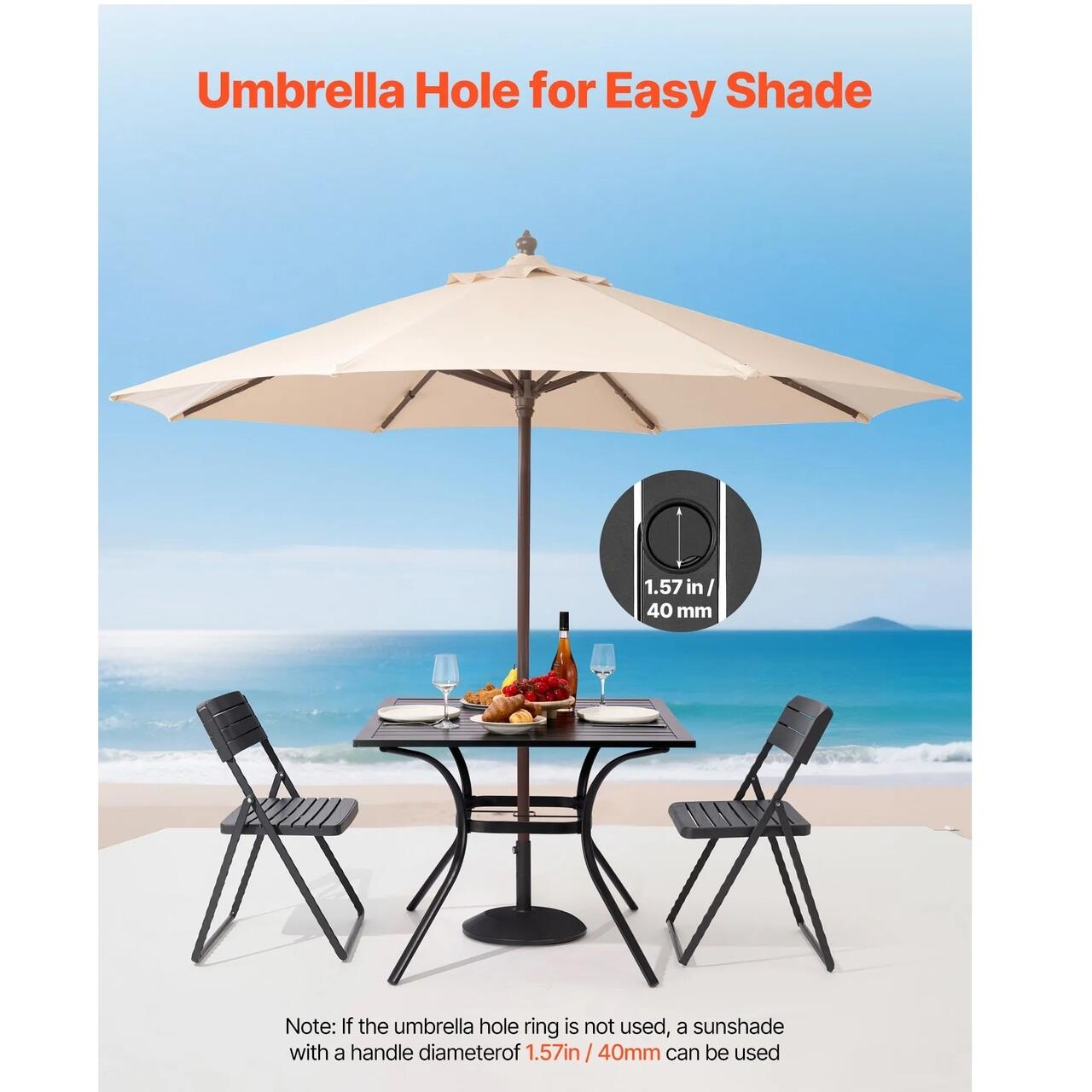 Design cu orificiu pentru umbrela: Aceasta masa de terasa pentru exterior include un orificiu pentru umbrela de 38 mm. Daca preferati sa nu utilizati inelul pentru umbrela, puteti monta o umbrela de terasa cu un diametru al manerului de pana la 48 mm, oferind confort atat la soare, cat si la ploaie.