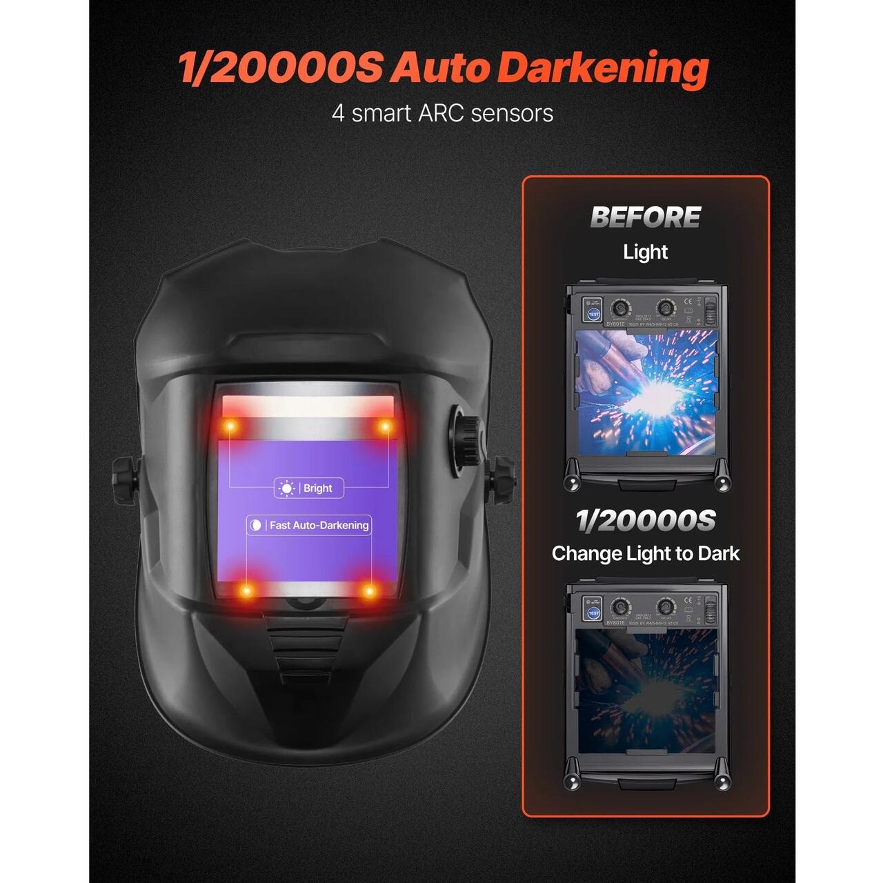 Intunecare automata in milisecunde: Echipata cu 4 senzori inteligenti pentru arc, hota noastra de sudura se intuneca automat in doar 1/20000 secunde - filtrand lumina daunatoare si intensa, reducand stralucirea arcului, imbunatatind claritatea vizuala si protectia ochilor.