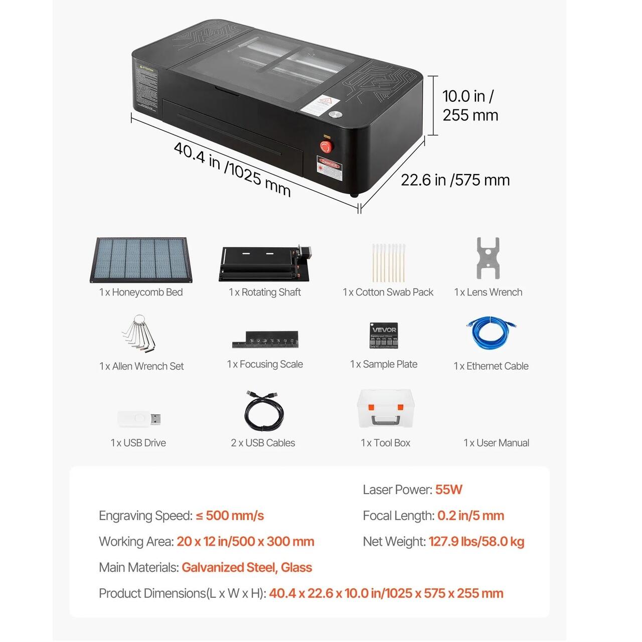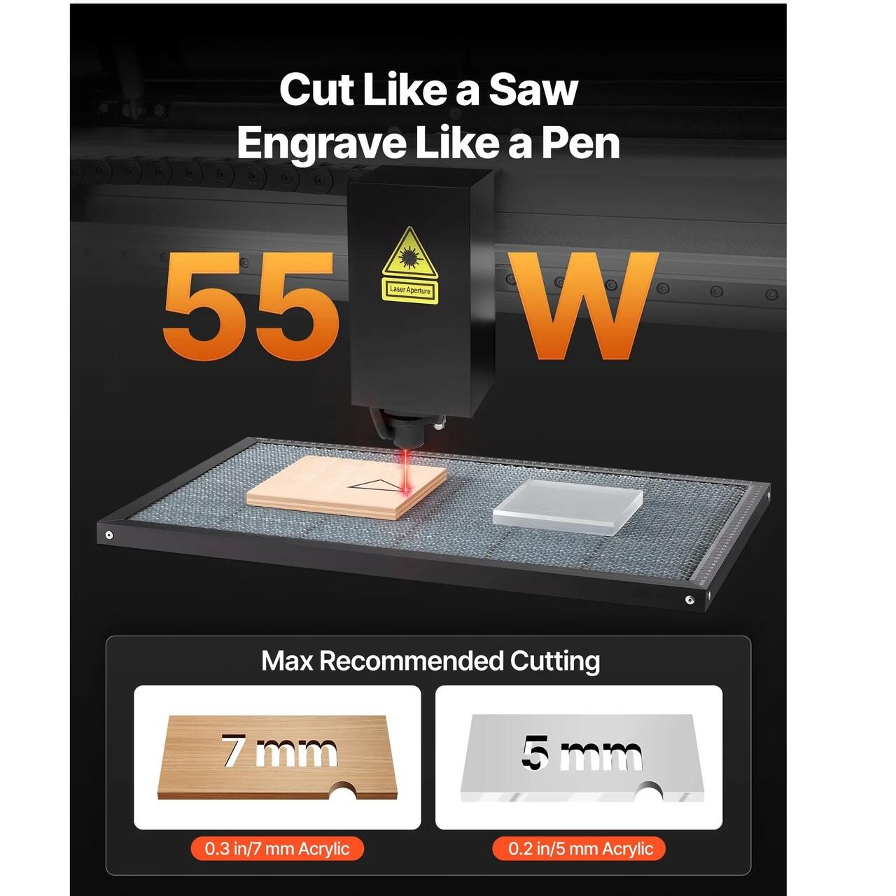Gravura si taiere de inalta eficienta: Acest gravator laser CO2 de 55 W graveaza sau taie lemn, acrilic si alte materiale nemetalice cu margini fara bavuri. Recomandat pentru acrilic ≤ 7 mm si lemn ≤ 5 mm, atinge pana la 500 mm/s. Durata de viata a tubului laser: peste 3.500 de ore. Nota: nu este pentru gravarea metalelor, este potrivit doar pentru metale acoperite.