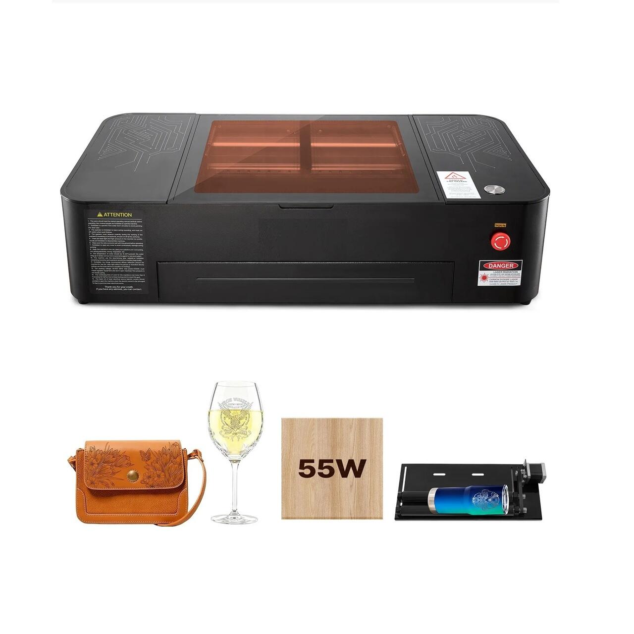 Masina de gravat si taiat cu laser 55 W, Zona lucru 50x30 cm, Viteza maxima 500 mm/s, pompa de apa, axa rotativa, LightBurn, CorelDRAW, RDWorks