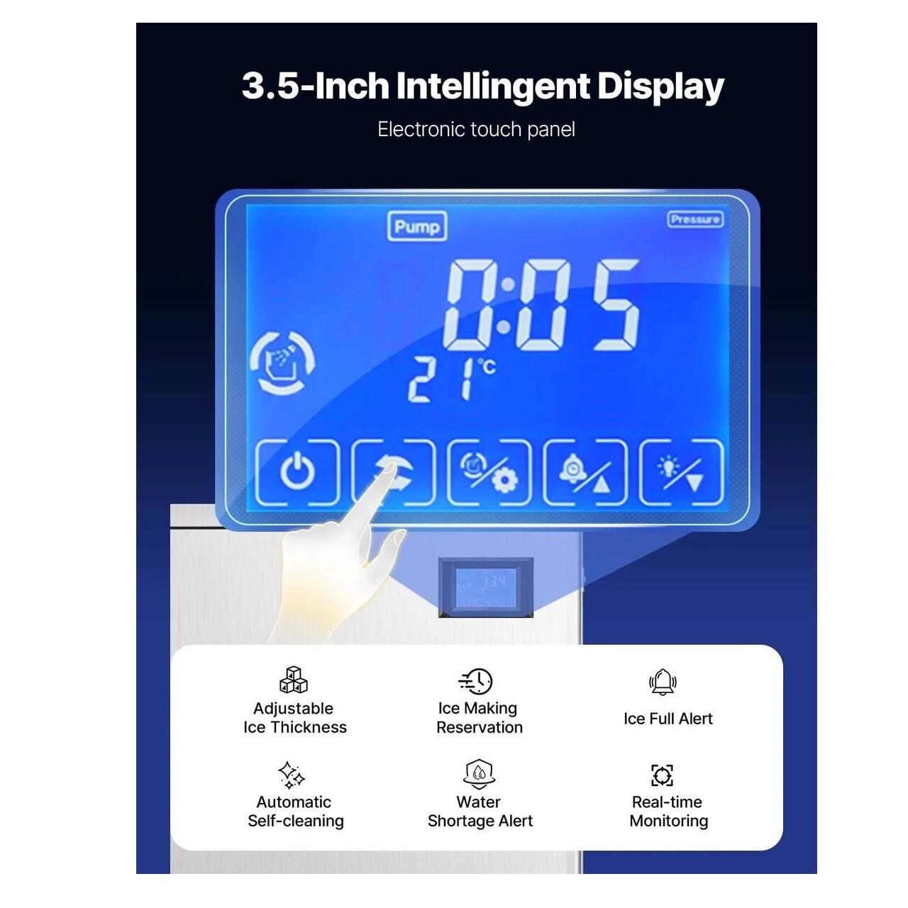 Panou de control inteligent: Masina noastra comerciala de gheata adopta un afisaj multifunctional prin care puteti observa procesul de fabricare a ghetii, puteti regla cu usurinta grosimea cuburilor de gheata, puteti actiona functia de curatare automata si puteti fi informat cu privire la starea in timp real prin intermediul indicatorilor luminosi ai panoului.