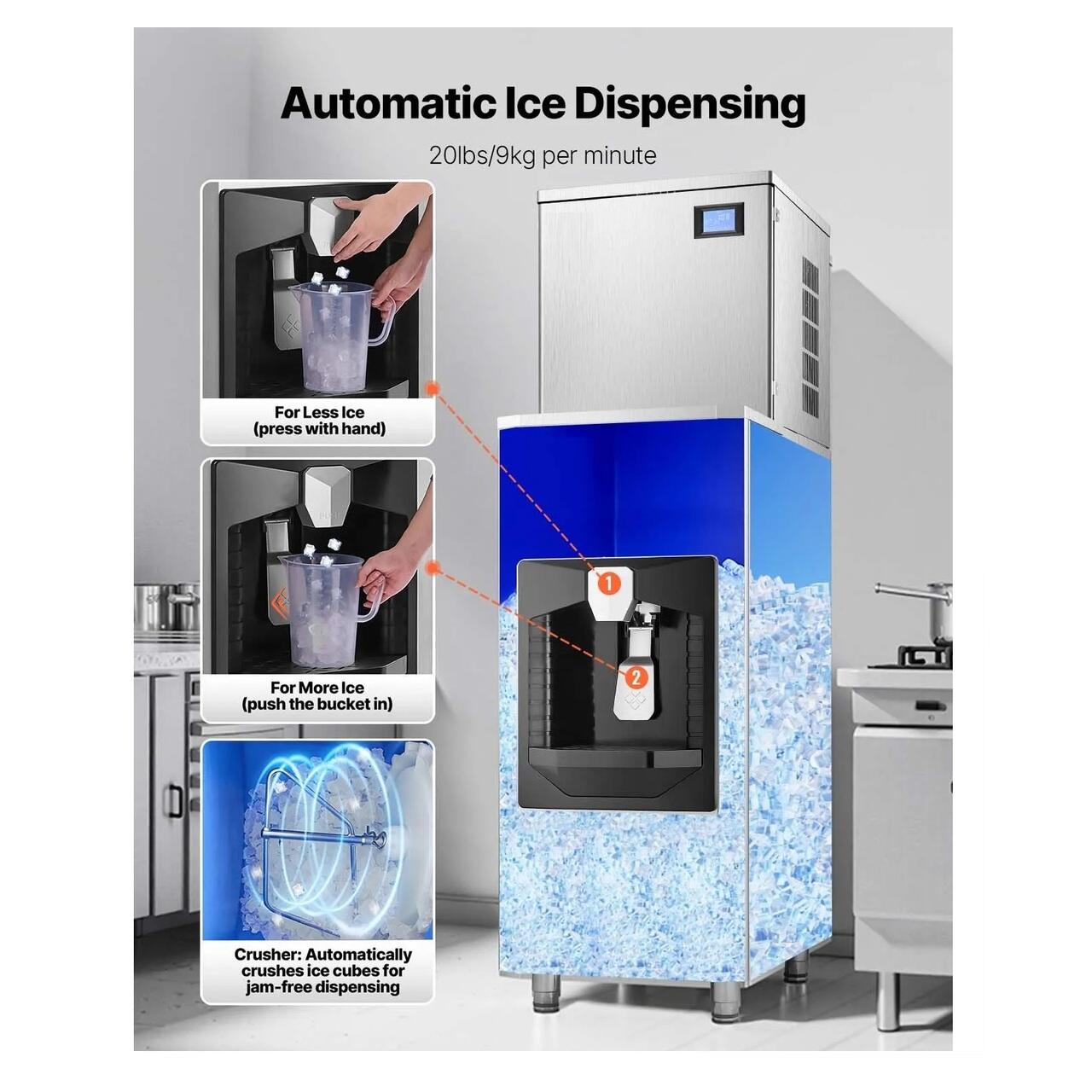 Dozator de gheata: Recipientul pentru gheata cu o capacitate de 74 kg dispune de o functie automata de distribuire a ghetii si poate distribui 9 kg de cuburi de gheata in fiecare minut.