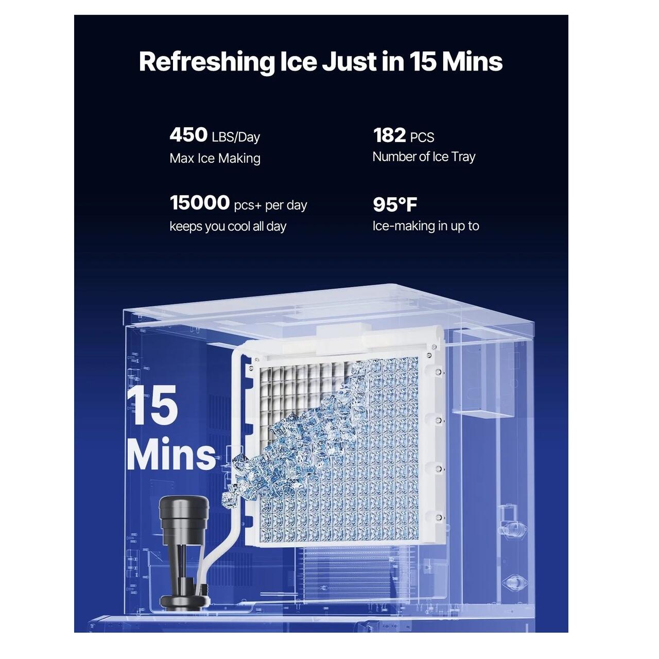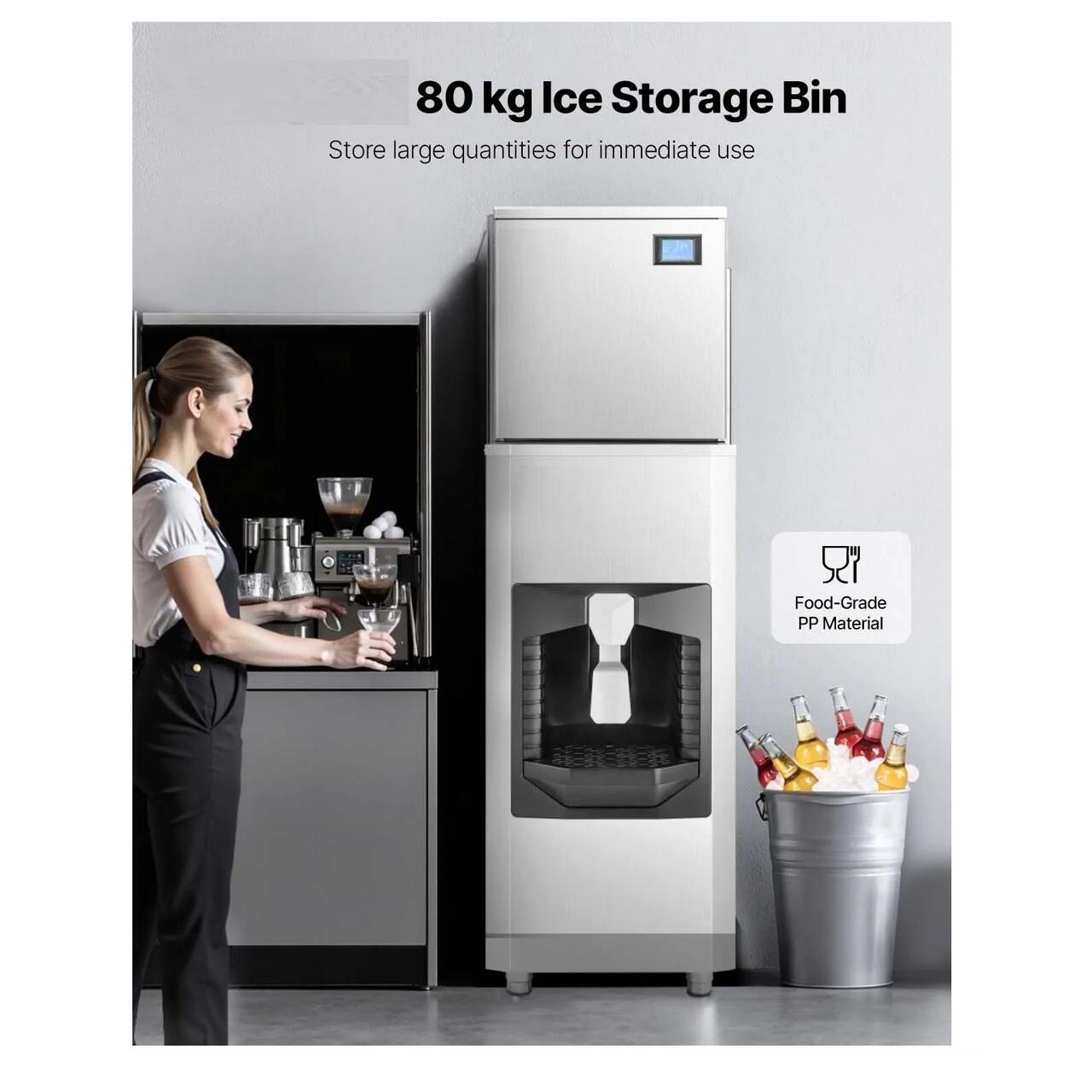 Productie rapida de gheata: Acest aparat de gheata comercial poate produce 200 kg de gheata in 24 de ore, este dotat cu 182 de tavi pentru gheata, iar compresorul puternic ii permite sa produca gheata in 12-15 minute, asigurand o alimentare continua cu gheata.