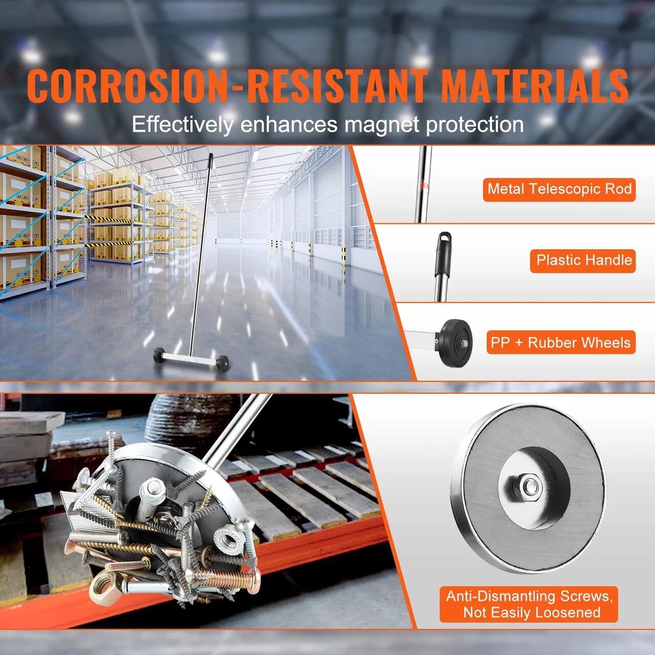 Putere magnetica superioara: Maturatoarea magnetica cu roti include o matura magnetica de 15'' cu roti si un instrument telescopic magnetic de ridicare de 3,2'', capabil sa sustina pana la 8 lbs (15''), respectiv 35 lbs (3,2''). Colecteaza fara efort cuie, suruburi si resturi metalice negre, protejandu-va de cioburi si metale ascutite.