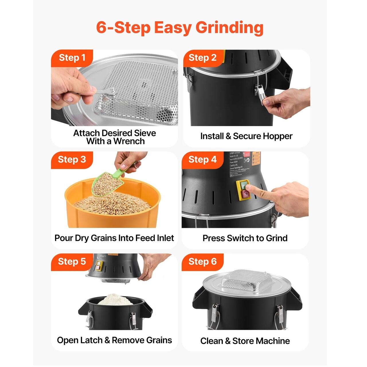 Proces rapid de macinare in 6 pasi: Aceasta rasnita de faina este usor de utilizat: instalati sita, fixati butoiul, turnati boabele, apasati comutatorul, colectati pulberea, curatati si depozitati, totul se face in cateva minute.
