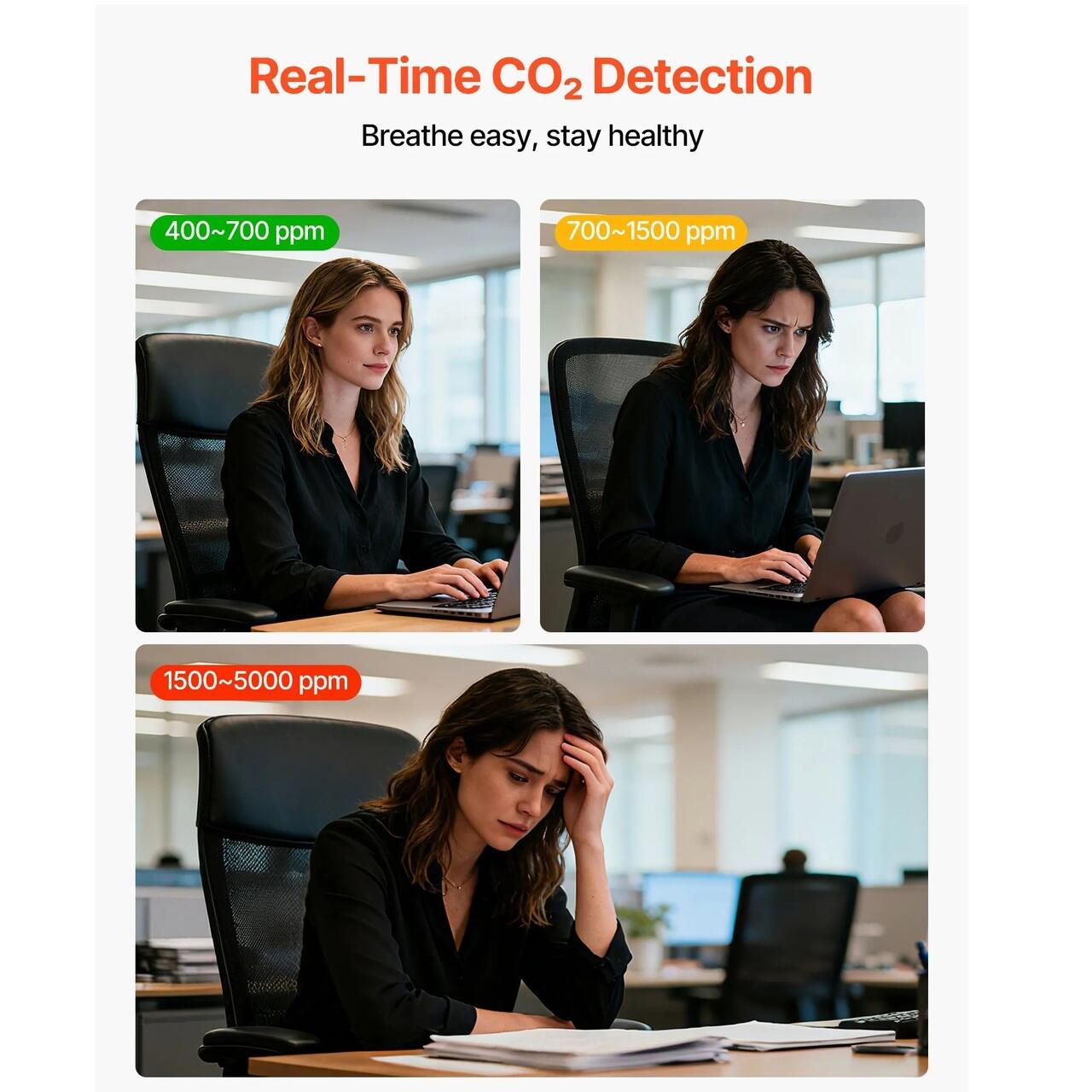Monitorizare instantanee a aerului: Monitorizati instantaneu aerul din interior cu acest detector de dioxid de carbon CO2. Un senzor infrarosu de inalta sensibilitate masoara CO₂ in timp real, in timp ce indicatorii multicolori ghideaza vizual deciziile de ventilatie, facilitand monitorizarea rapida a conditiilor aerului din interior.